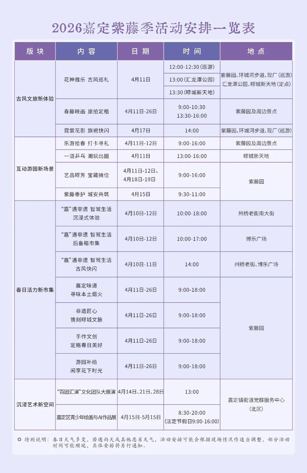 温馨提示:春日天气多变,若遇雨天或其他恶劣天气,活动安排可能会根据现场情况作适当调整,部分活动时间可能顺延,具体安排将另行通知,请密切关注“上海嘉定”微信公众号。感谢您的理解与温柔相待,愿我们都能在最好的天气里,遇见最美的紫藤。