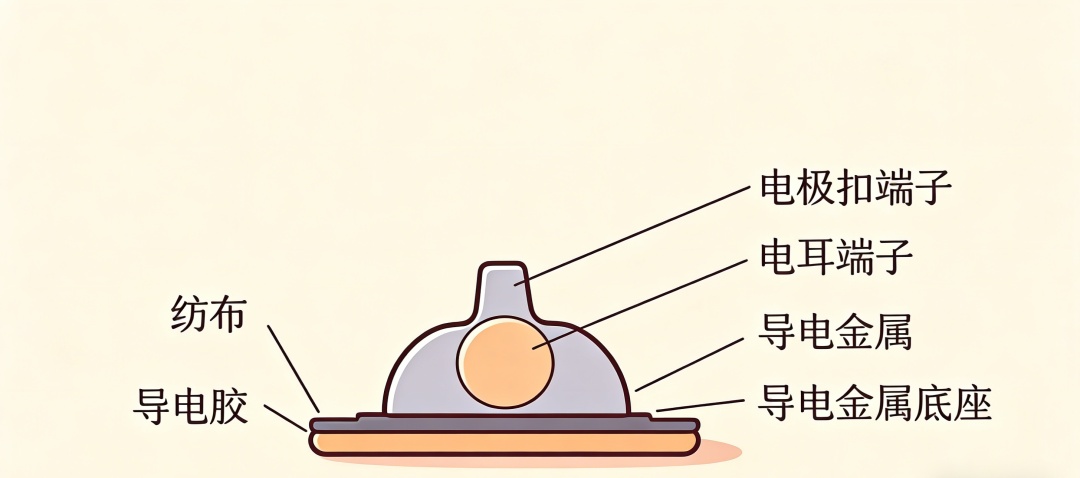 本专利提供了一种新型心电电极贴片,兼有电极扣和插头端子,既能兼容传统心电图机的香蕉头或直插头,还能兼容心电监护仪对应的电极扣,解决了临床部分患者胸壁瘦小、皮肤菲薄,进行心电图检测时缺少操作空间、负压吸球固定不牢靠等痛点,结构简单,可长期应用,能更好的满足临床需求。