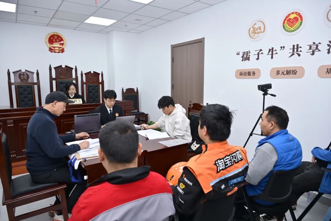 与此同时,一起外卖骑手在执行配送任务时,与行人发生非机动车交通事故后引发的侵权赔偿案件在综治中心社区巡回法庭(孺子牛共享法庭)开庭审理,来自不同站点的快递外卖员们和人民调解员到庭旁听。