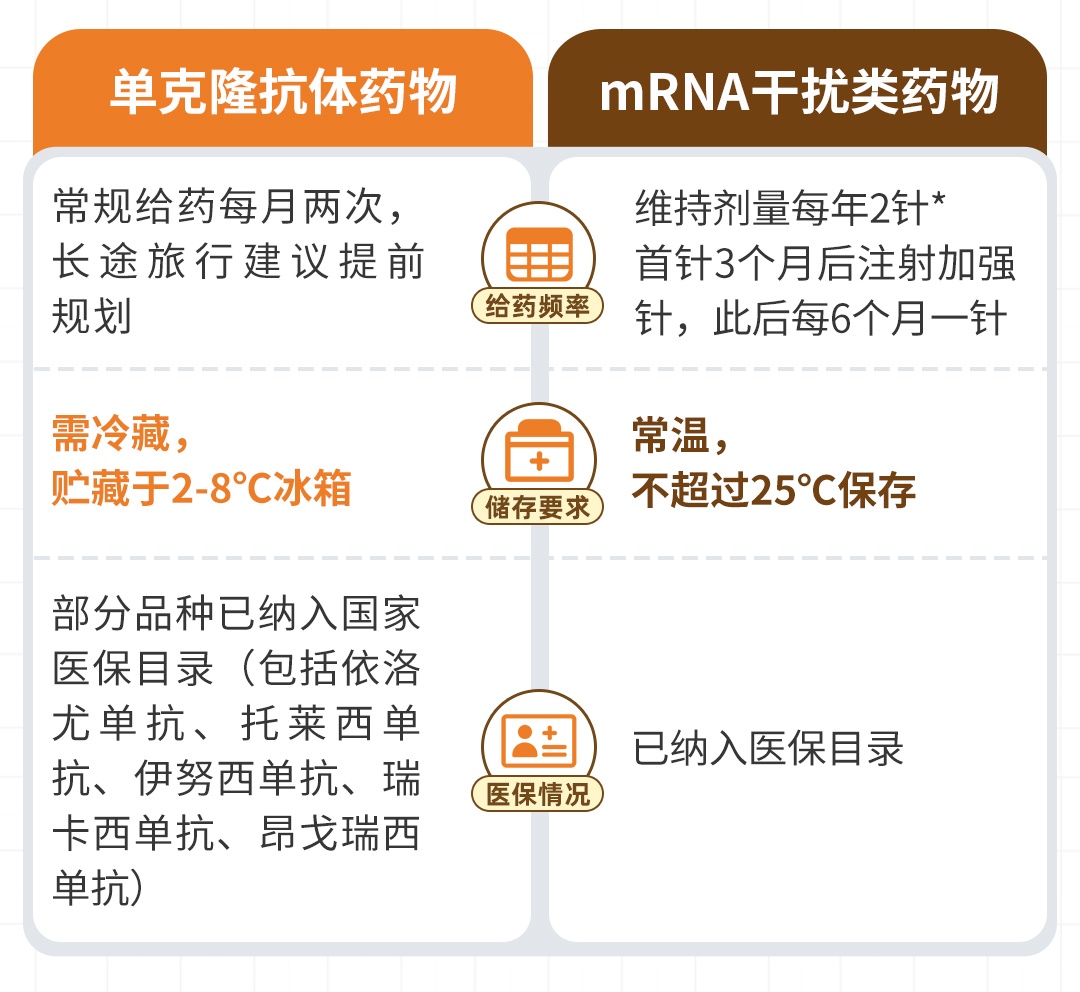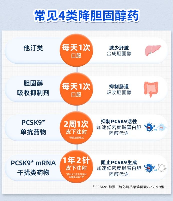 通过干扰PCSK9蛋白的“生产图纸”——mRNA,上游抑制蛋白合成,也是增强肝脏的清理能力,主动清除血液中已有的“坏胆固醇”。目前医保范围内的药物有英克司兰。使用方式为第一次注射后的第3个月注射第二次,随后每6个月注射1次,维持期每年两针。