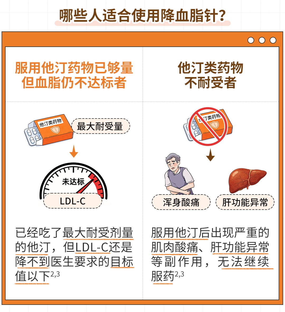 降脂针不是想打就打的,是否需要使用必须由医生全面评估后决定,对于心血管疾病高危人群、口服降脂药效果不佳等情况,必须更强、更精准的治疗时才会推荐。