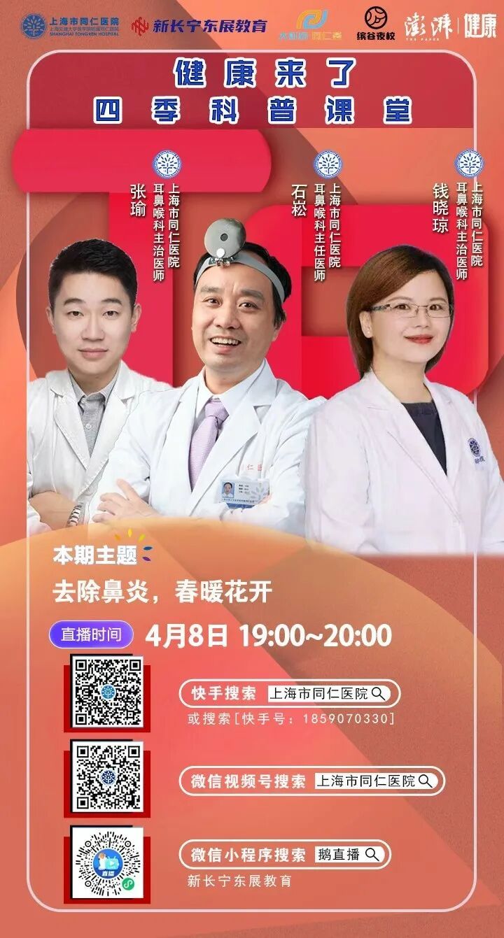 科普线上直播 活动时间 2026年4月8日19:00—20:00 如您错过,可视频号观看回放 直播主题 去除鼻炎,春暖花开 关爱鼻腔健康,畅享清新呼吸——鼻腔不仅是呼吸的第一道门户,更是守护肺部健康的重要防线。让我们从每一次顺畅呼吸开始,悉心呵护这一容易被忽视的器官。诚挚期待您的参与,一起为健康呼吸助力! 供稿:苏甜甜 审核:石 崧 校审:戴 云 预约就诊请关注公众号: (配图源自网络,如有侵权请通知删除) TONGREN HOSPITAL 上海交通大学医学院附属同仁医院 欢迎关注同仁医院官方微信服务号