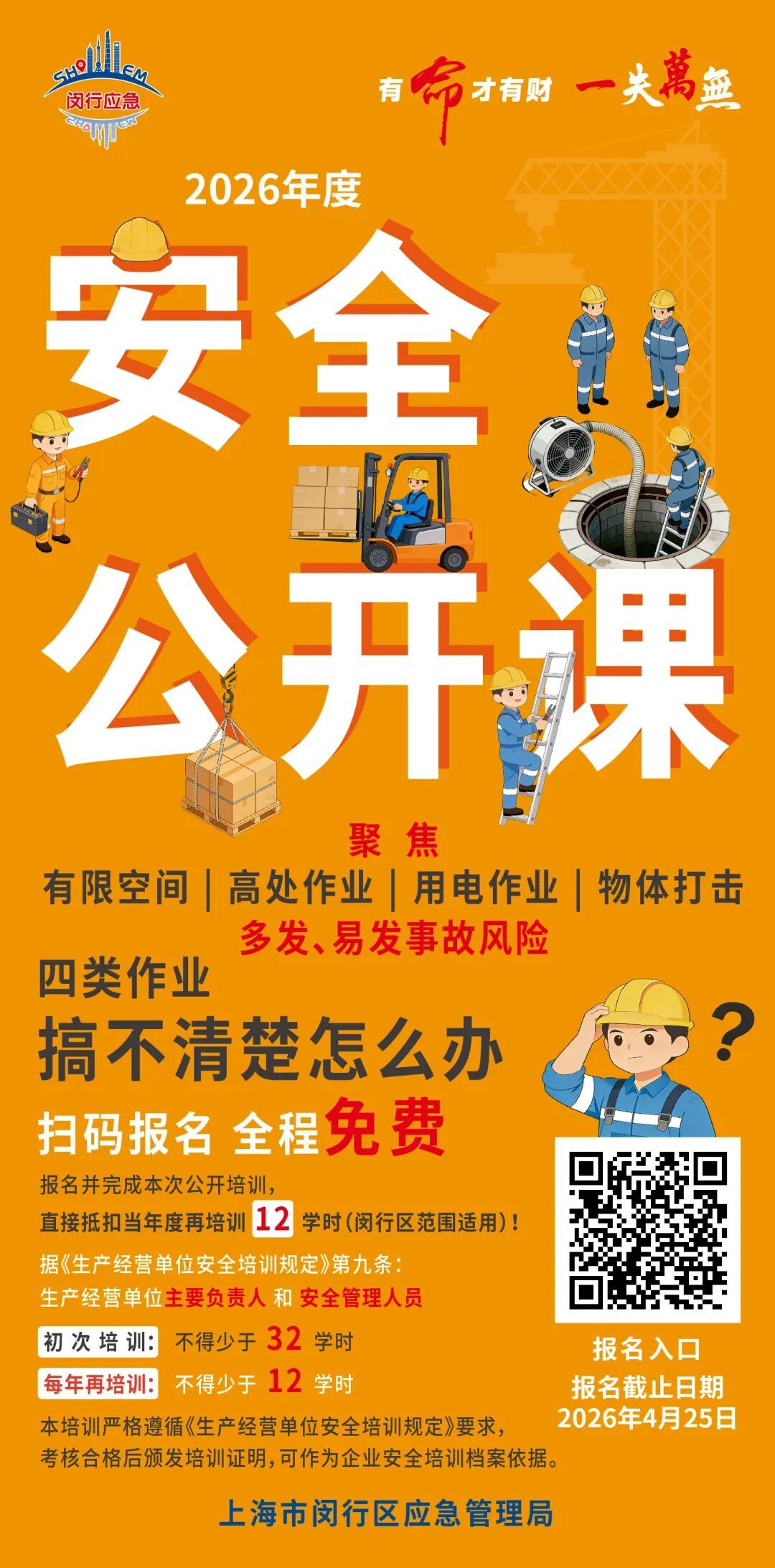安全才是“硬通货”! 闵行区应急管理局2026年度安全公开课 火热报名中…… 专治四类作业“疑难杂症” 免费学 能抵扣企业主要负责人、 安全管理人员当年度安全培训课时 扫码报名 一起为安全“充电”,让财富“续航”!