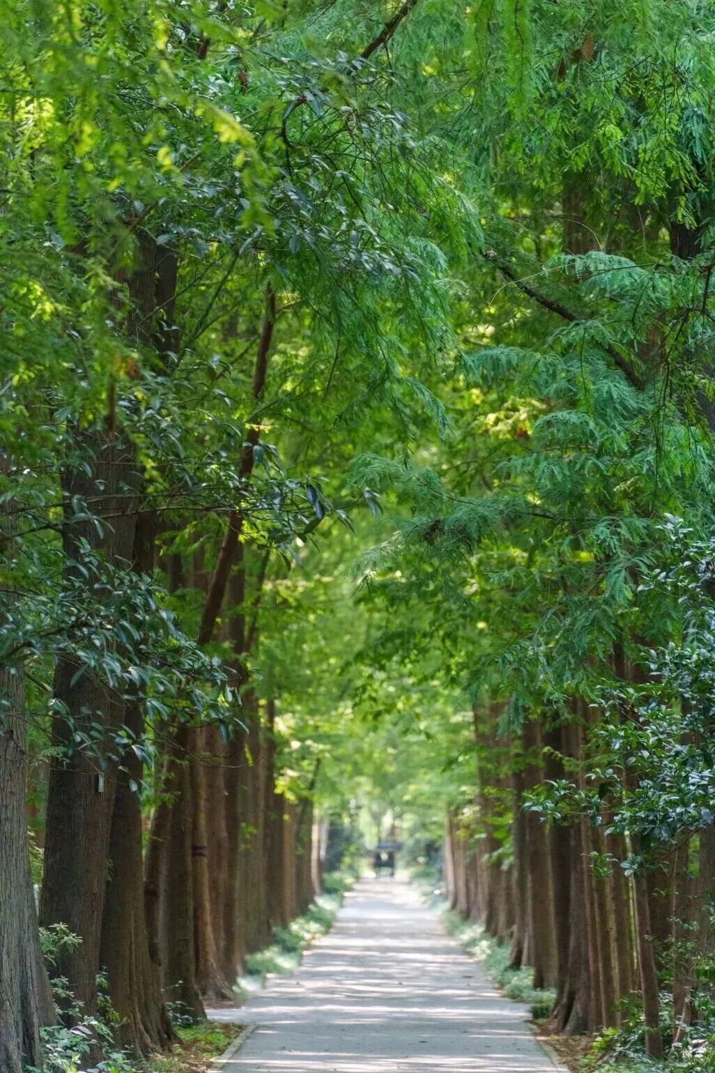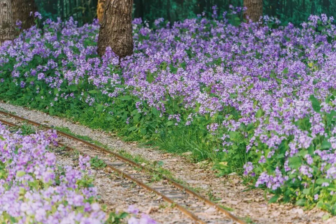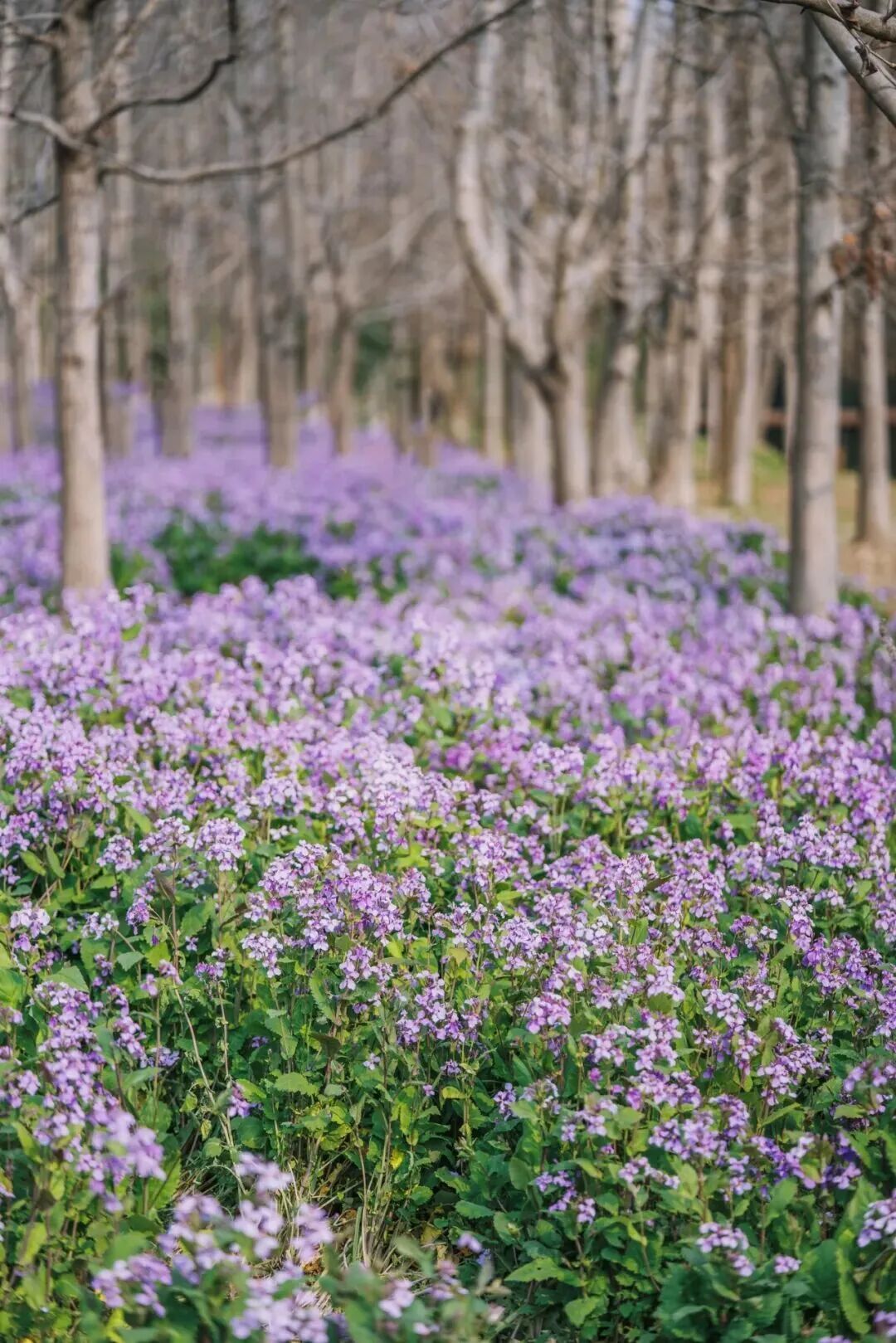 园内水杉林下、步道旁,大片二月兰肆意绽放,铺展成蓝紫色花海,阳光透过枝叶洒下,光斑落在花间,宛如走进童话森林。