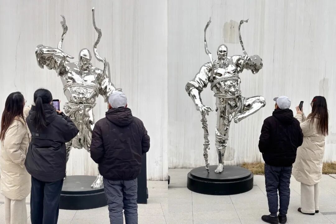 雕塑艺术家任哲的不锈钢作品《门神》点缀其间