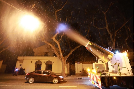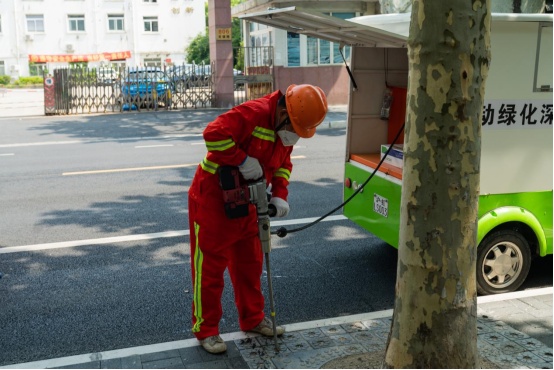 但对于中心城区树形高大,且修剪作业条件受限的道路,在果毛飘絮季,一般会采取物理吹冲的措施来治理,通过人工干预提前让果毛飘落,避免集中飘絮给市民出行带来影响。