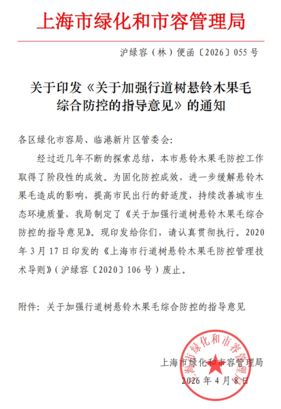 为尽量减少悬铃木果毛飘絮对市民出行的影响,上海市绿化和市容管理局近年来持续推进果毛飘絮治理工作,并将此项工作纳入了局2025年、2026年度绿化市容行业民生实事。