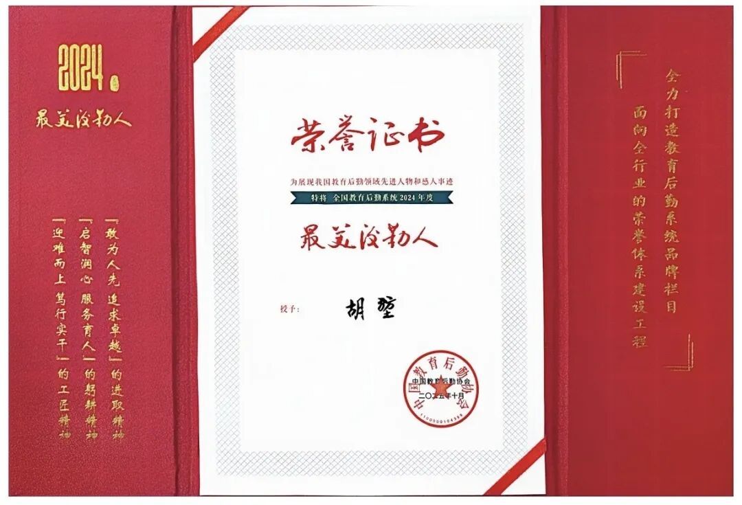 2025年10月,胡堃获评全国教育后勤系统的“最美后勤人”,从跨界“小白”到行家里手,他的成长历程,书写在无数个日夜对一个又一个细节的较真与优化中。