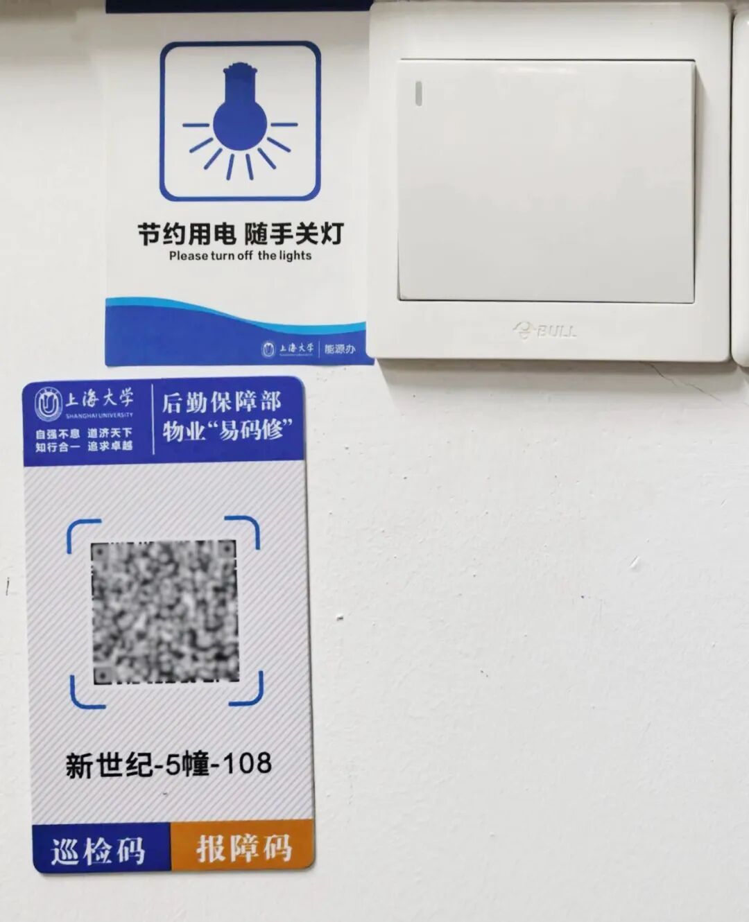 在上海大学的校园里,几乎每栋楼、每个公共区域,都贴着一个小小的二维码。灯泡坏了、门锁松了、空调不制冷了——扫一扫,问题上报,维修师傅就会带着合适的零件出现在门口。