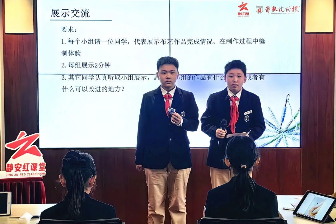 在随后的劳动课程中,静教院附校余慧芬老师从情景剧引导学生深入思考劳动精神的实质。学生运用所学的基本针法,以小组形式完成一件缝纫作品,并分享在劳动过程中遇到的困难和解决办法,体会劳动精神的内涵。课程结束后学生还将亲手制作的手工作品参与校园义卖公益集市,完成“劳动—价值—收获”教学闭环,激发学生自立自强,建立用双手创造美好生活的信心。