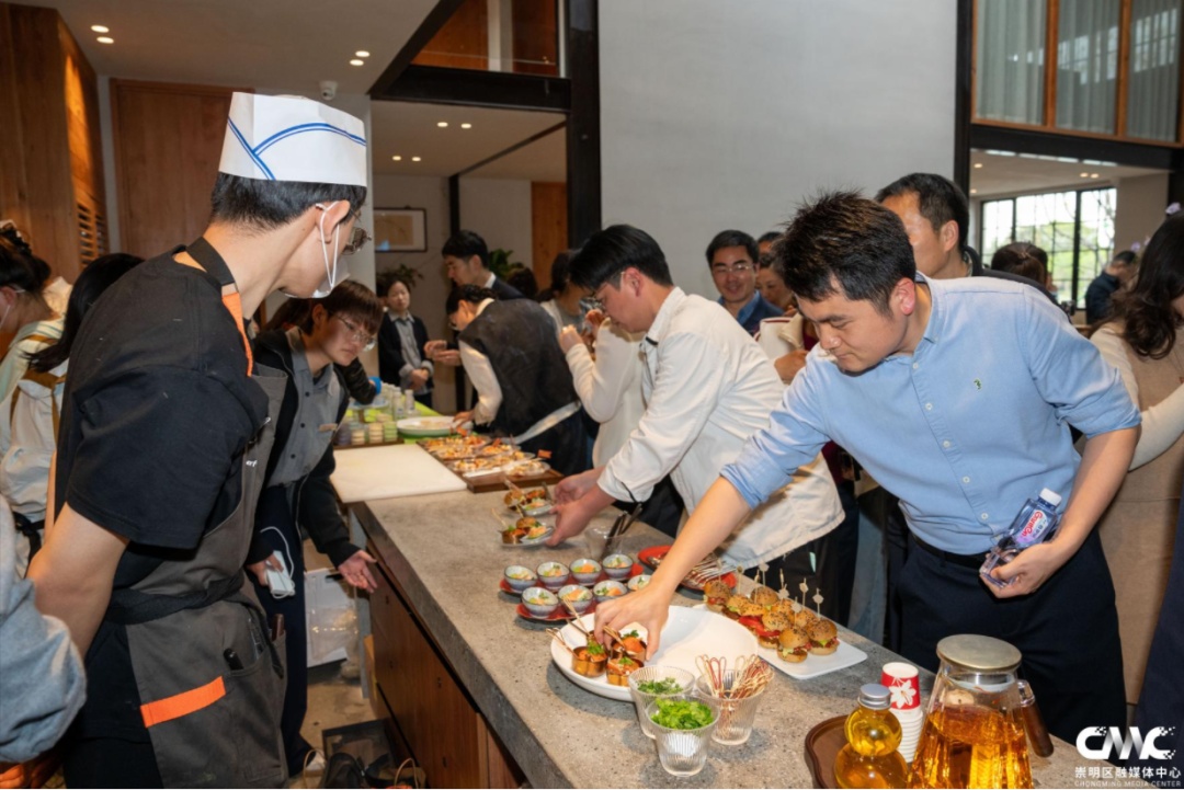 本次发布会以“好物首发、美食首展、品牌首店、美服首秀”四大板块为核心,全方位呈现崇明春季消费新亮点、新场景。其中,“美食首展”无疑成为现场最具人气的焦点,走进活动会场,各个新品试吃摊位前早已人头攒动、热闹非凡,摊主们手脚麻利地不停制作、摆盘,餐品一端上桌就被拿取一空,现场烟火气十足。