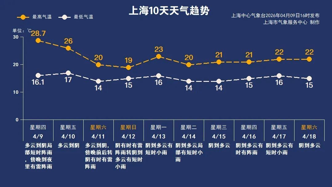 本周双休日气温有所回落,最高气温在19—20℃。周六白天天空状况依旧不错,傍晚起逐渐转雨,主要降水时段会从周六晚上持续到周日白天。下周西南暖湿气流活跃,上海多降水过程。气温相对平稳,最高气温在20—23℃之间,最低气温在14—16℃之间波动。春季天气多变,提醒大家关注临近预报,了解最新的预报预警信息。
