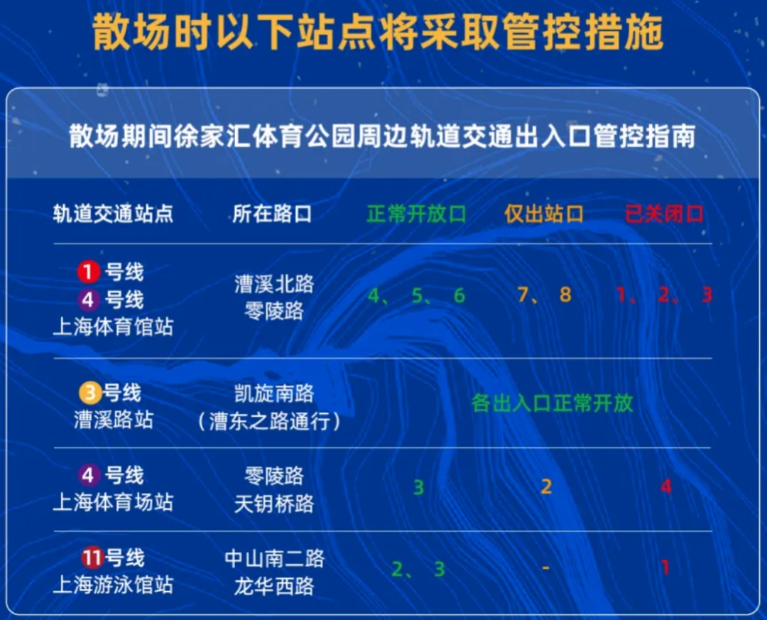 赛事散场时,请听从现场工作人员的引导分批离场。乘坐轨道交通的球迷请注意徐家汇体育公园内及周边道路上沿途设置的提示牌,听从工作人员引导,有序排队迸站。
