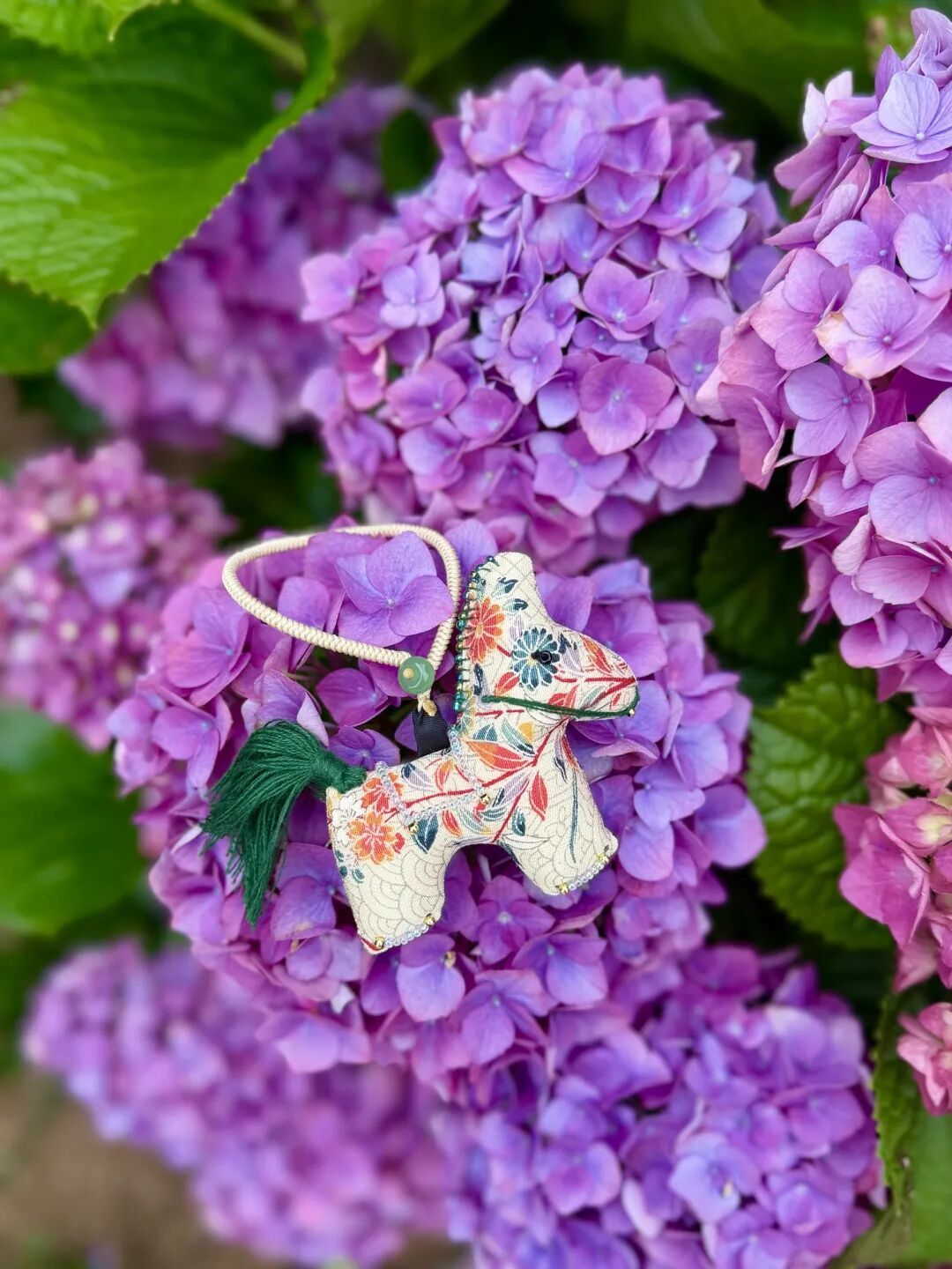 浅色小马在紫罗兰的绣球花瓣上显得文静娟秀。