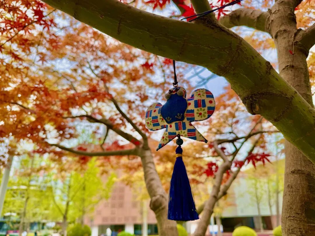 布艺纸鸢悬挂在枫树枝头随风摇曳。