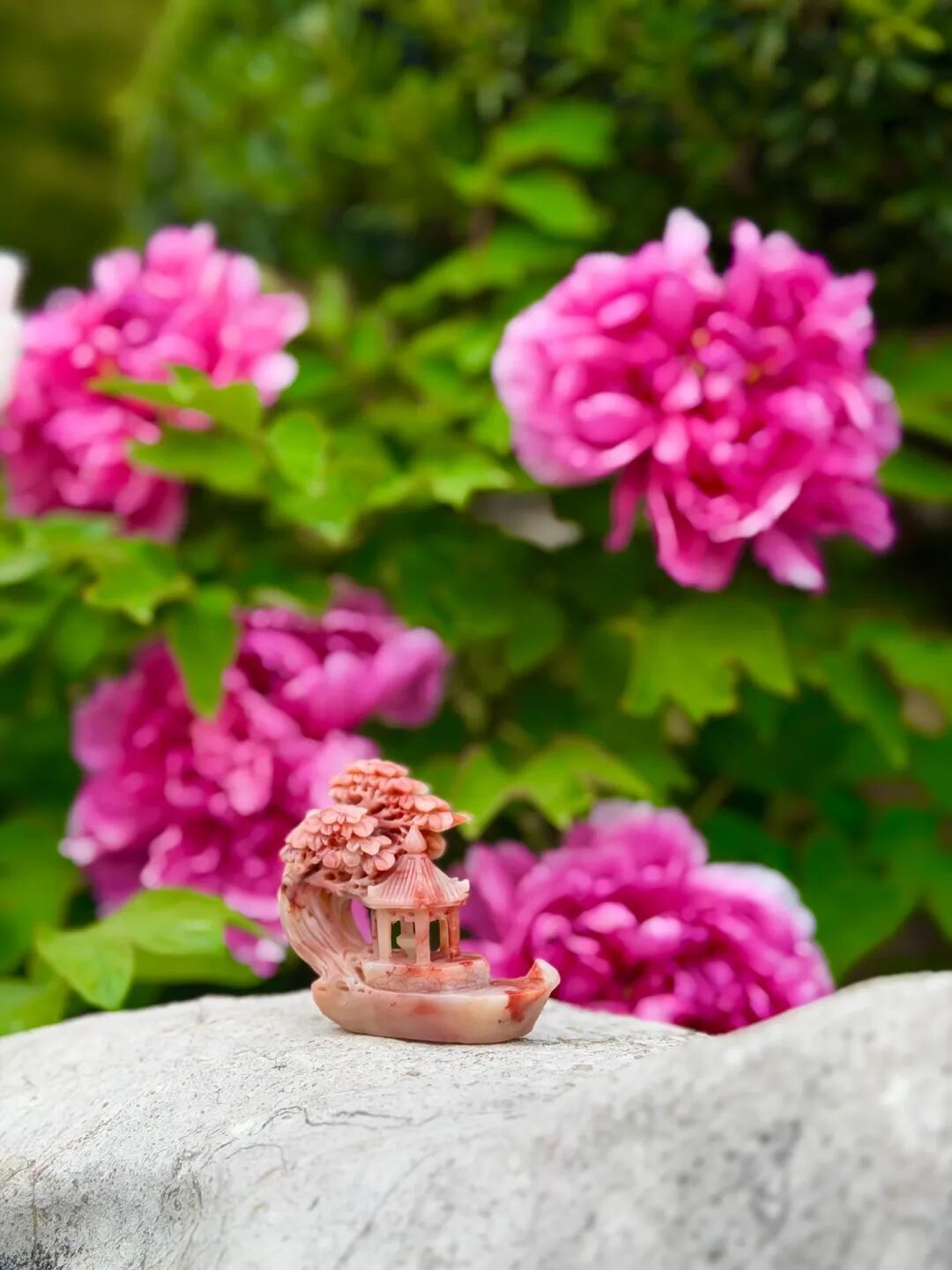 复兴公园的牡丹花开得正盛,家里如果有中式小摆件,可以在花丛前一摆,一幅国风味满满的神仙画面就孕育而生了。素雅的亭台楼阁微景观配上背后艳丽的红与绿,不是蓬莱胜似蓬莱。