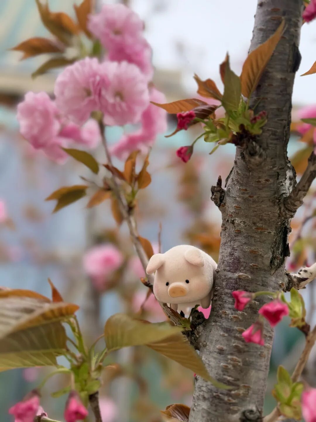 躲在晚樱树上的粉嫩小猪,在清爽的风中对你眨了眨眼。