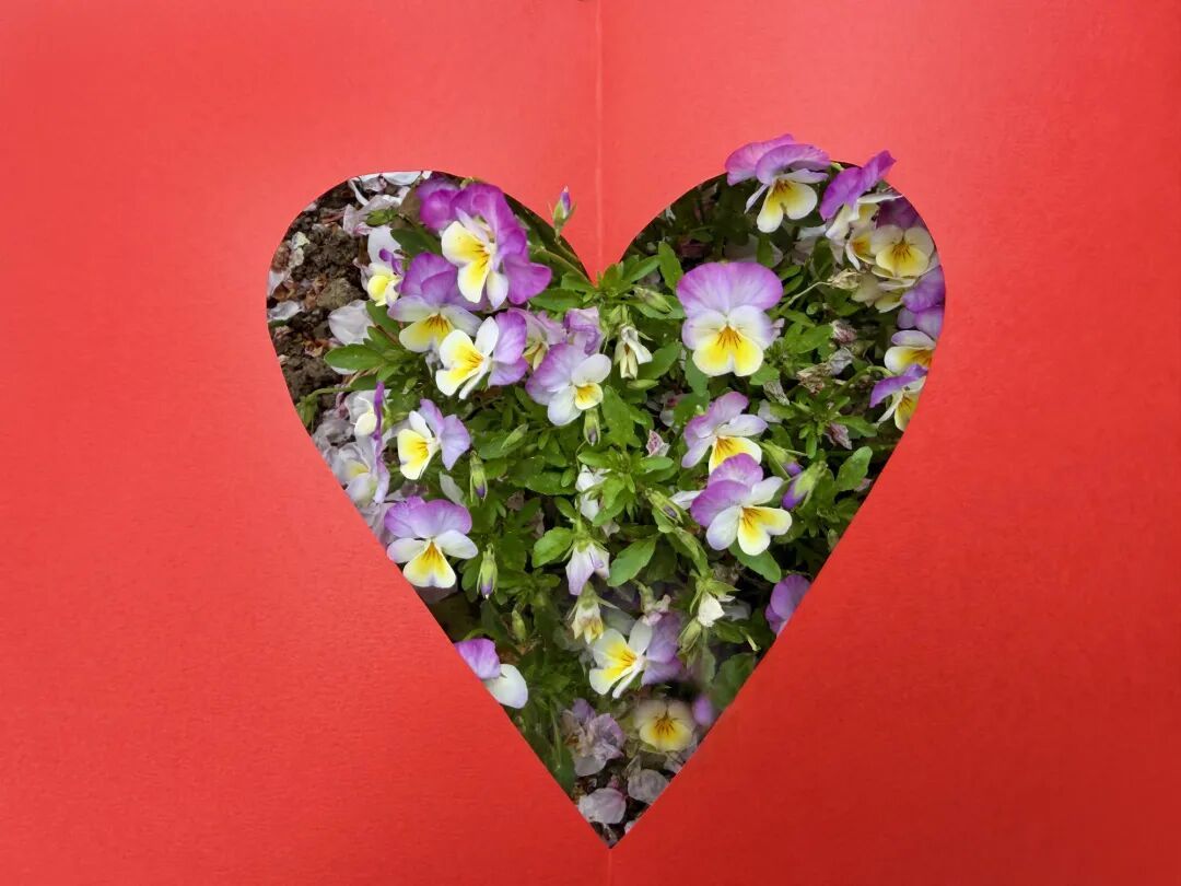 把家里剩余的红纸对折,从中间剪出一个爱心来。红纸平铺在草坪上,鲜艳的花儿从爱心中欢快生长。