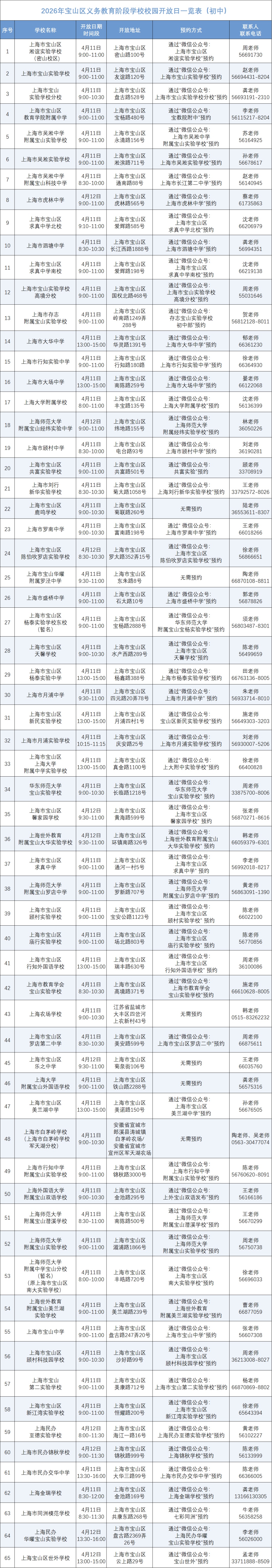校园开放日宝山区义务教育阶段学校见证成长 共育未来小学初中注:具体信息以宝山区政府门户网站教育局专栏为准通讯员:王韵骁编辑:孙宇瑶资料:宝山教育*转载请注明来自上海宝山官方微信