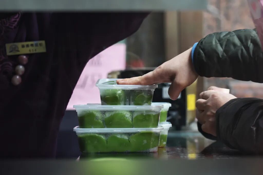 青团的制作以麦草、艾草等植物的汁液,与糯米粉一起揉成团,包入豆沙、枣泥等馅料后蒸制而成。毕旭玲补充,青团是一种历史悠久的节日食品,其雏形是宋代寒食、清明时节的染青饭、粉团类点心。至晚在清代,青团已经发展成熟,《随园食单》中就有“捣青草为汁,和粉作粉团,色如碧玉”的记录。