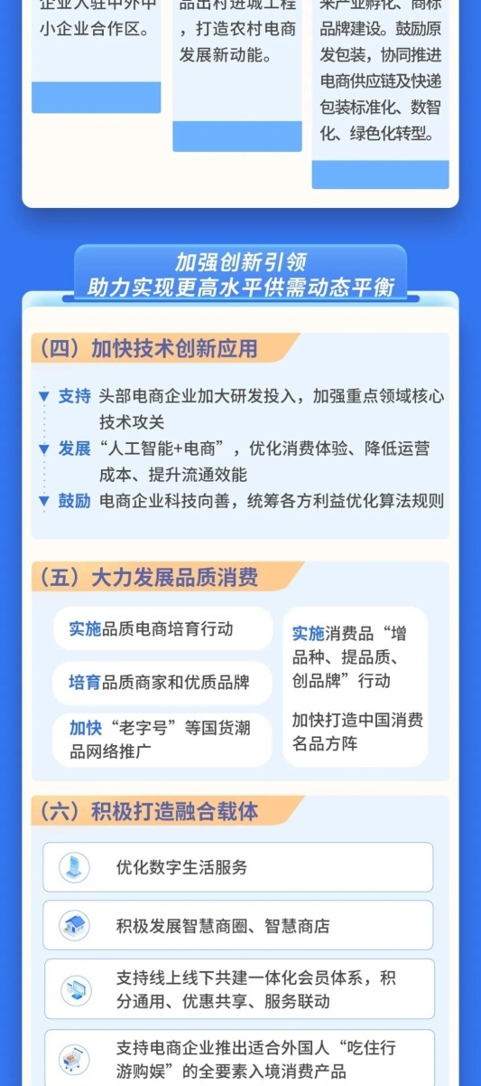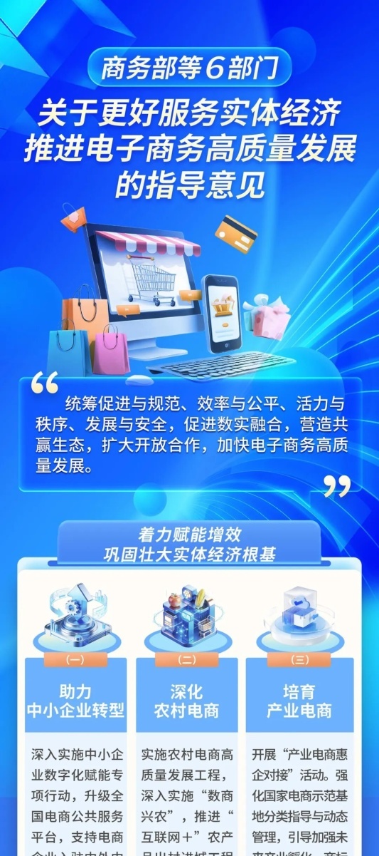 电子商务是数字经济领域发展迅速、创新活跃、应用丰富的重要组成,已成为发展新质生产力的新动能。为持续推进电子商务高质量发展、高水平开放、高效能治理,更好服务实体经济巩固壮大,商务部等6部门发布指导意见,来看一图读懂↓