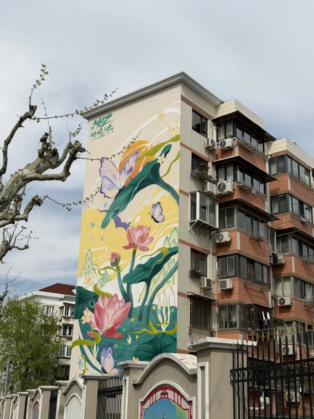 作为小区的“门面担当”,那面蝴蝶荷花彩绘墙早已成了居民手机里的“常客”。结合新泾镇水网密布的生态特色,白墙黛瓦间,一朵朵“荷花”摇曳生姿,让原本单调的外立面有了江南水乡的灵动气韵。