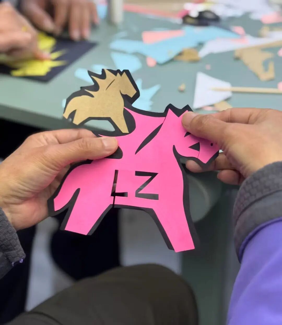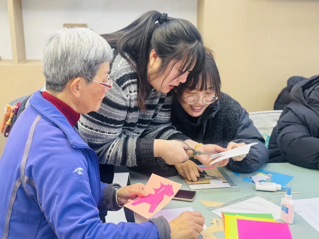 展览之外,一场“春风裁骏影”剪纸体验活动同步展开,在一楼居家养老服务中心里,银发学员在中级工艺美术师胡月溦的指导下,感受刀剪游走的韵律。大家围坐一堂,手中彩纸折叠翻转,剪刀起落间,一幅幅萌态的骏马剪纸渐次成形,“老师,帮我在马背上剪个名字吧!”一位阿姨指着旁边刚剪好的“马上有福”,满脸期待。指导老师接过剪刀,三两下便在骏马身侧勾勒出灵动的字母轮廓,引得大家纷纷赞叹。