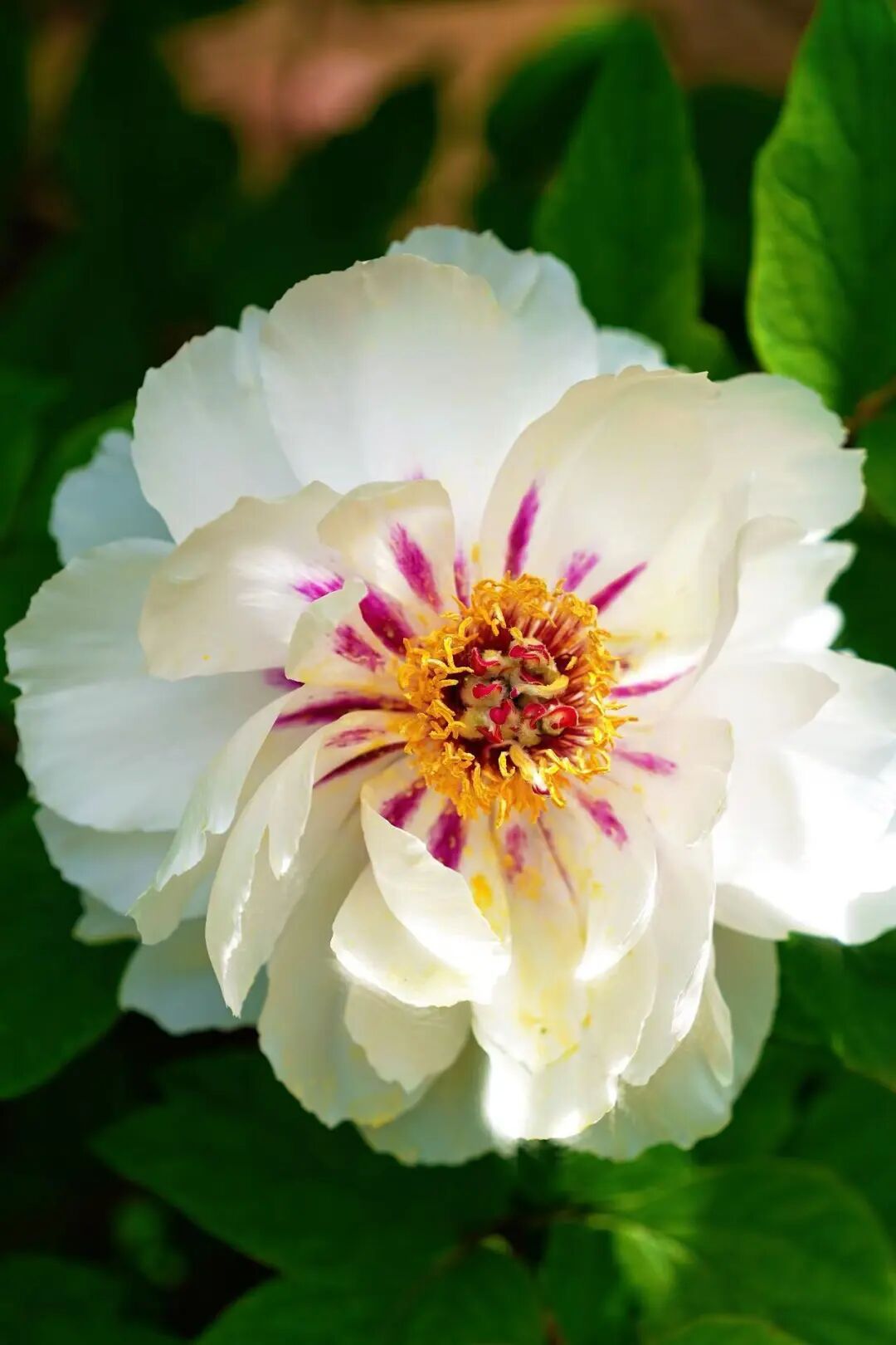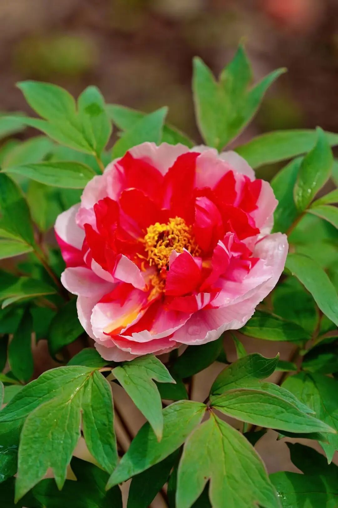 复色名品岛锦最为夺目,作为蔷薇型牡丹的佼佼者,它以“一花双色、一树百态”惊艳全场。鲜红与粉白的色彩并非泾渭分明,而是如晕染般自然交融,或半片红、半片白,或丝丝缕缕、交错相嵌,同一株上能开出红花、粉花,甚至一朵花内红白交织,变幻莫测,在万绿丛中如锦缎流光,成为摄影镜头追逐的焦点。