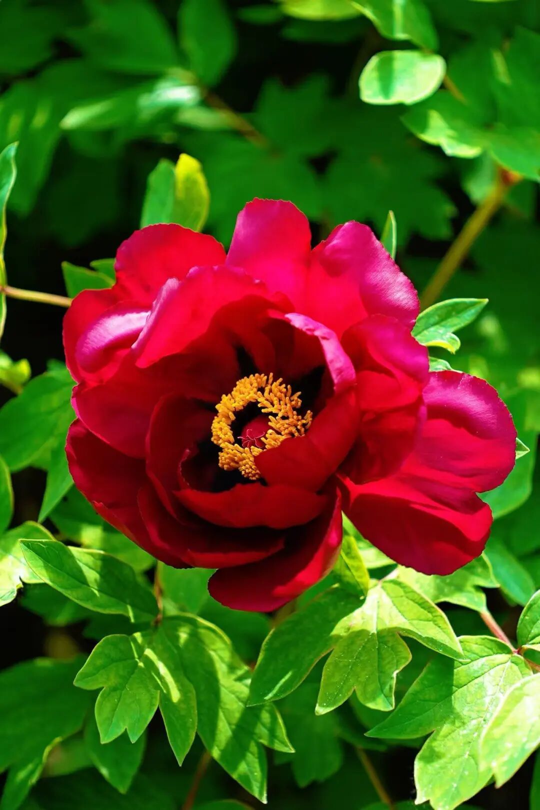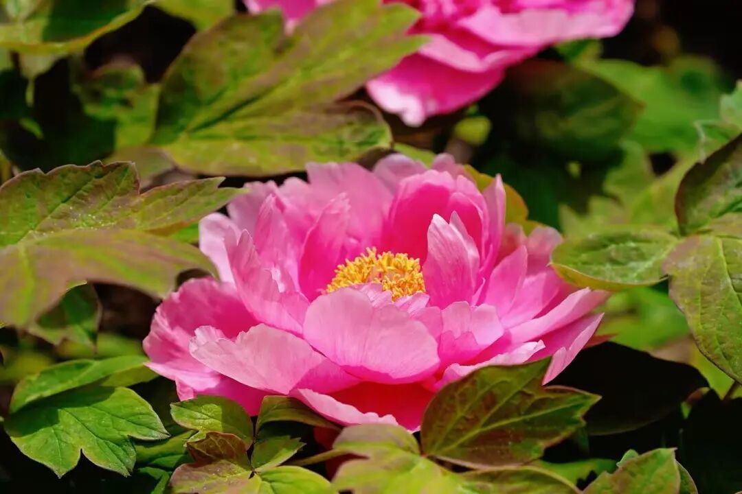 玉楼春则是粉色系中的清雅代表,花型高耸如楼,属典型的皇冠型。花蕾圆润,初开时为娇嫩的淡粉色,渐次盛放时,花瓣由外向内层层变浅,最外层粉红温润,内层洁白如雪,引来不少游客合影。胡红则是传统红牡丹中的经典,花型圆润饱满,呈端庄的皇冠型。花瓣层层叠叠,排列整齐,色泽是纯正浓郁的玫红色,不偏不倚,艳而不俗,远观如团团云霞,热烈而不失雅致,微风过处,暗香浮动。