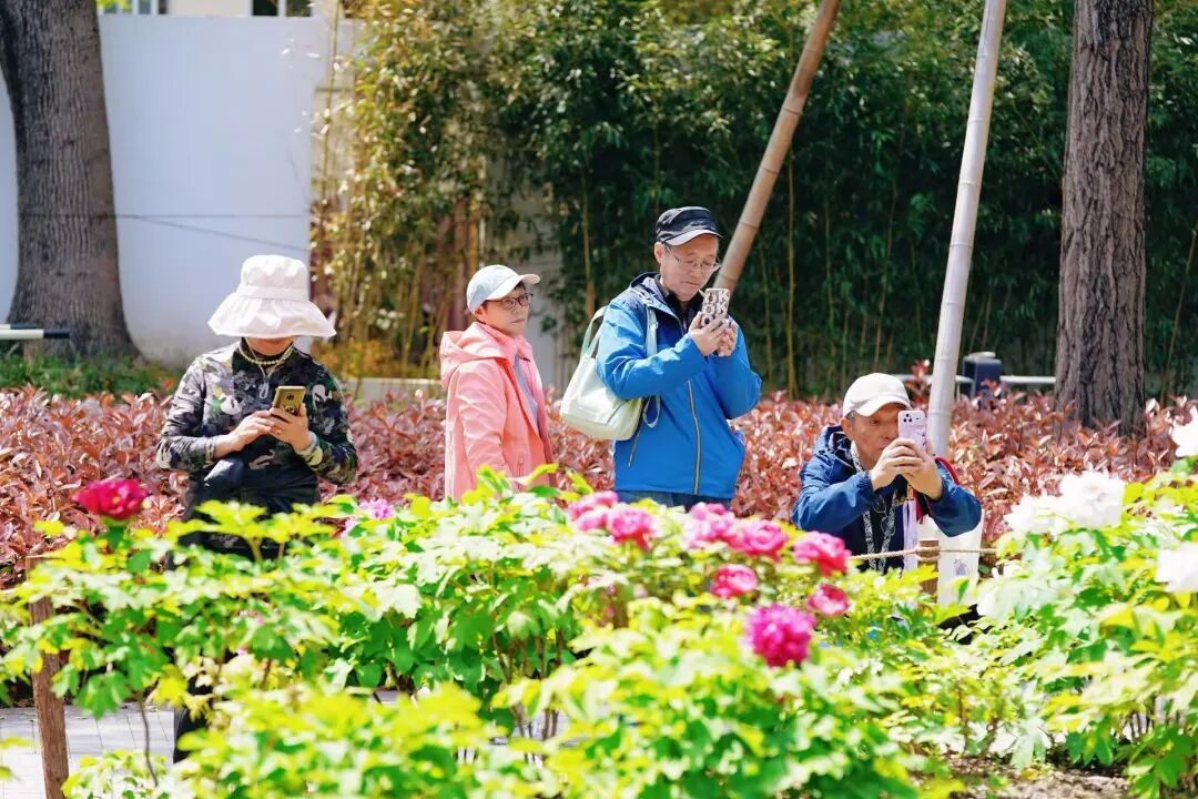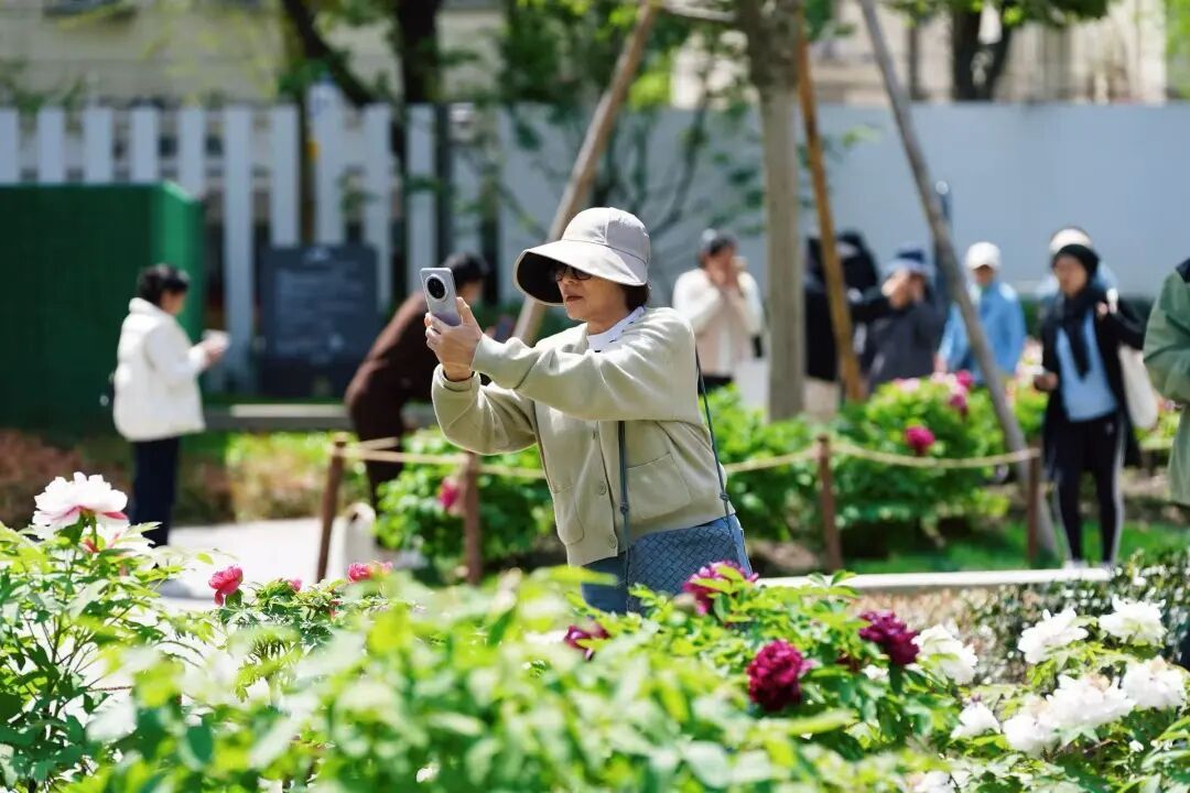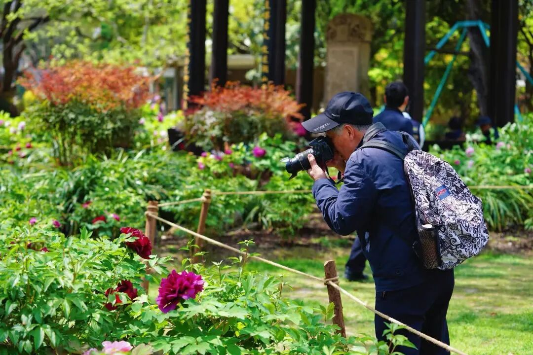 园内处处是赏花人,也成为摄影爱好者的创作天堂。牡丹丛边、古亭旁、太湖石边,总能看见架着长枪短炮的摄影发烧友。尤其是珍稀的晚花绿牡丹品种绿幕隐玉旁,他们或蹲或站,凝神对焦,只为捕捉牡丹最美的瞬间。有家住外区的游客,为了拍摄牡丹,这一周已经专程赶来三次,她告诉记者,“我4月2日就来过了,5日又来了一次,当时魏紫还是花苞,今天特地来看一下,很幸运绿牡丹也开了,太难得了,一次看了好几种名品。”