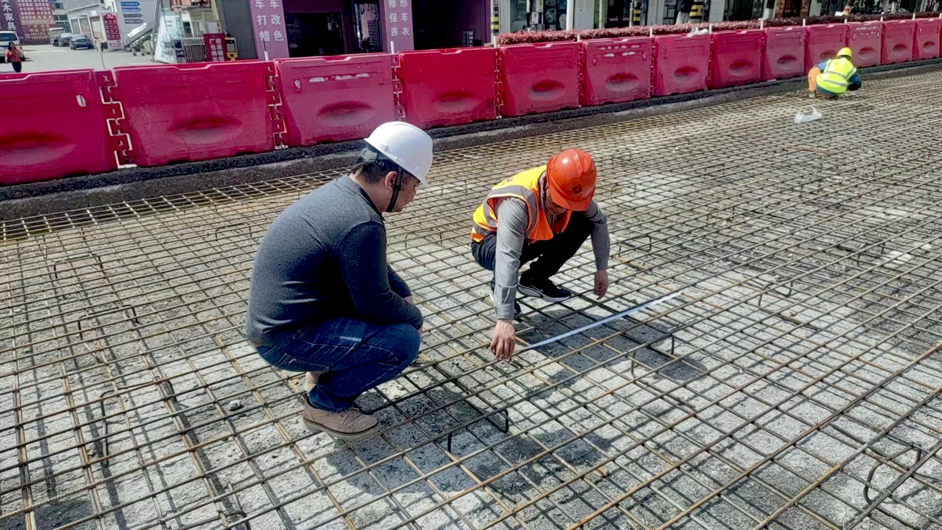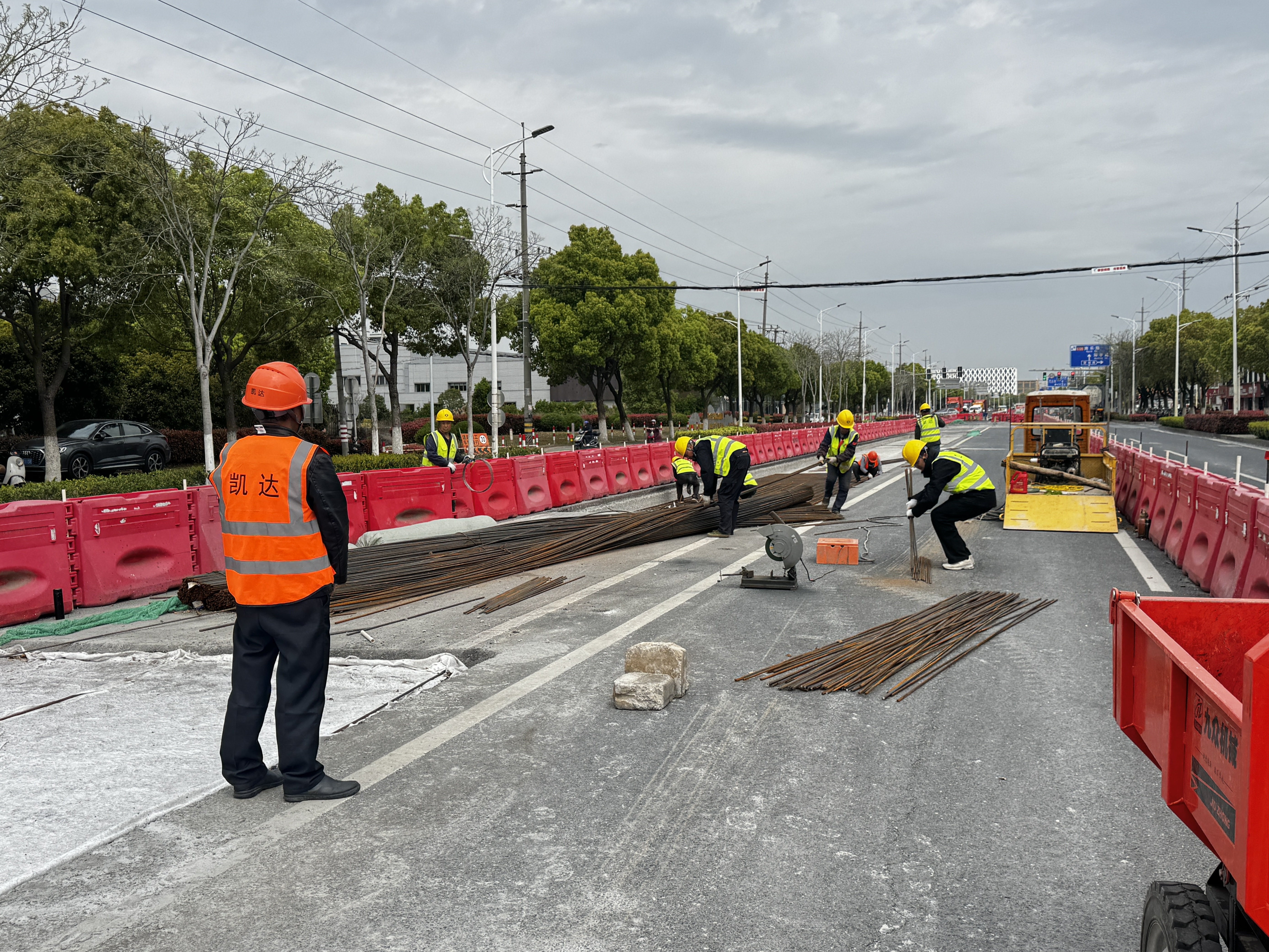 4月8日下午,记者在施工现场看到,施工路段已搭设临时护栏,清晰分隔作业区与通行车道,铣刨机正有条不紊地对老旧路面进行破除作业;另一处作业面内,工人们忙着进行钢筋绑扎,按设计尺寸切割后的钢筋被精准搭建在路面结构层内,为后续混凝土浇筑、路面铣刨等工序筑牢基础。
