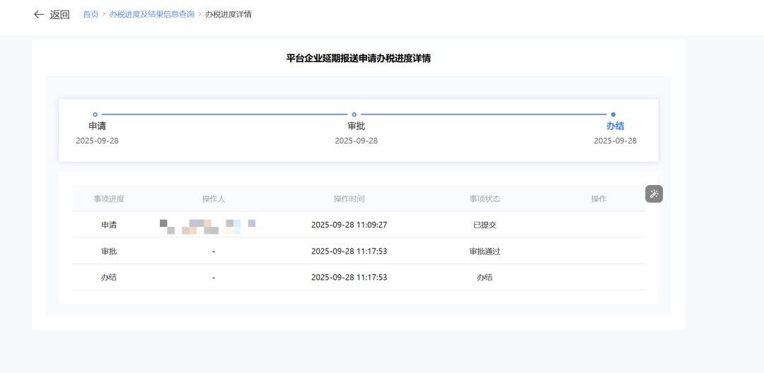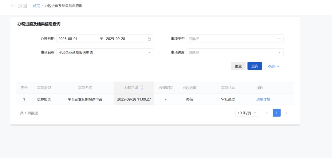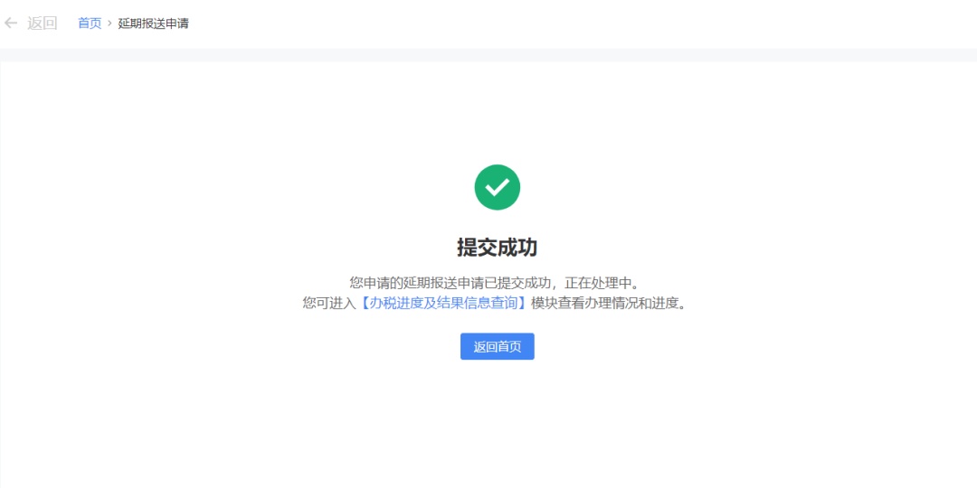 完成填写后,点击【提交】按钮,完成业务提交,可点击【办税进度及结果信息查询】链接或通过路径【我要查询】-【涉税信息查询】-【涉税事项进度查询】-【办税进度及结果信息查询】,进入模块查询延期报送申请办理进度。