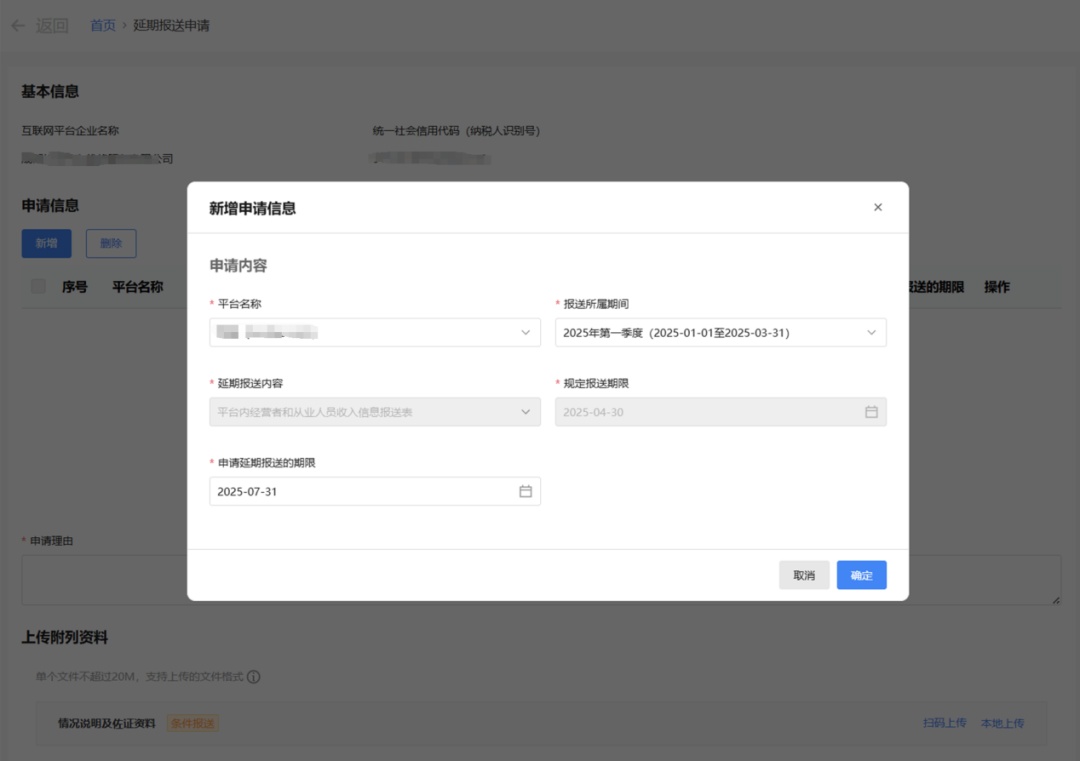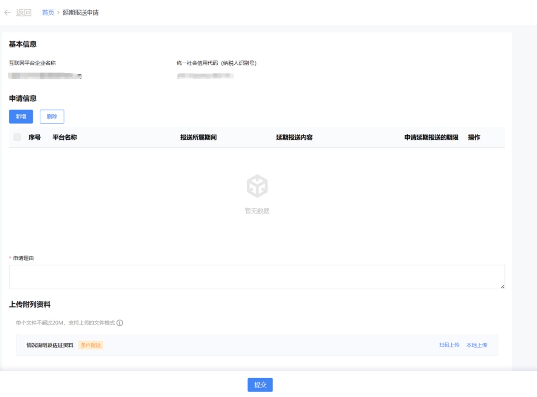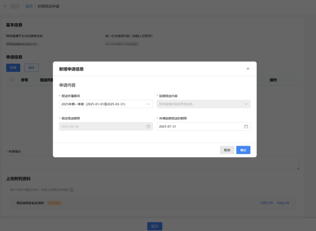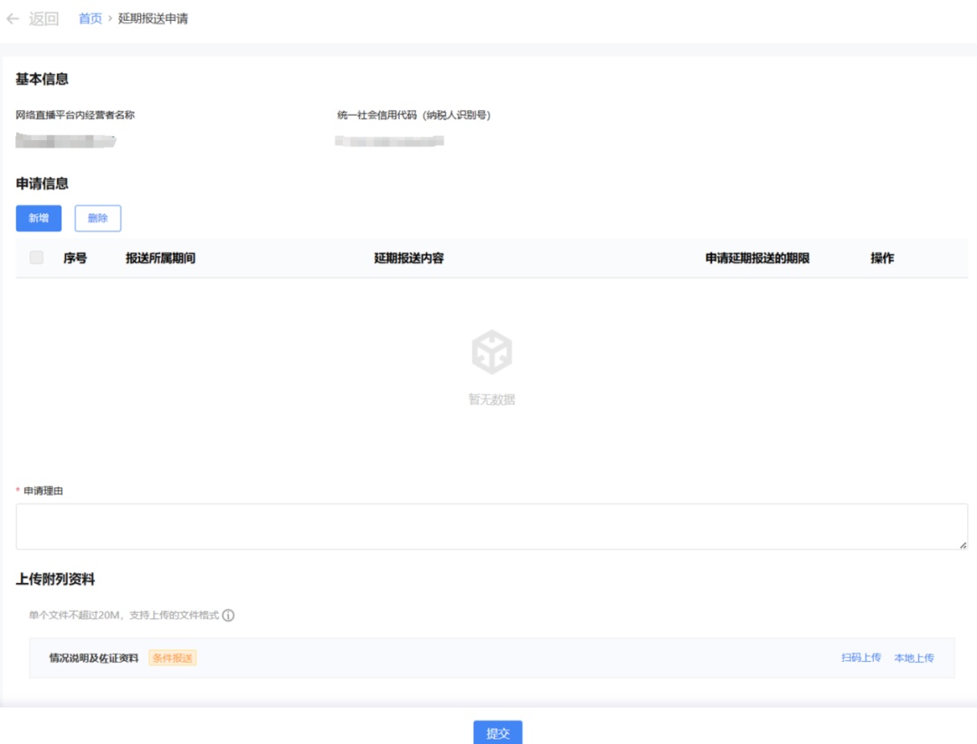 系统会自动带出基本信息以及规定报送期限,纳税人即可申请延期报送,填写申请理由等相应信息。并根据报送条件按需上传附列资料。网络直播平台内经营者和平台企业将有所不同。