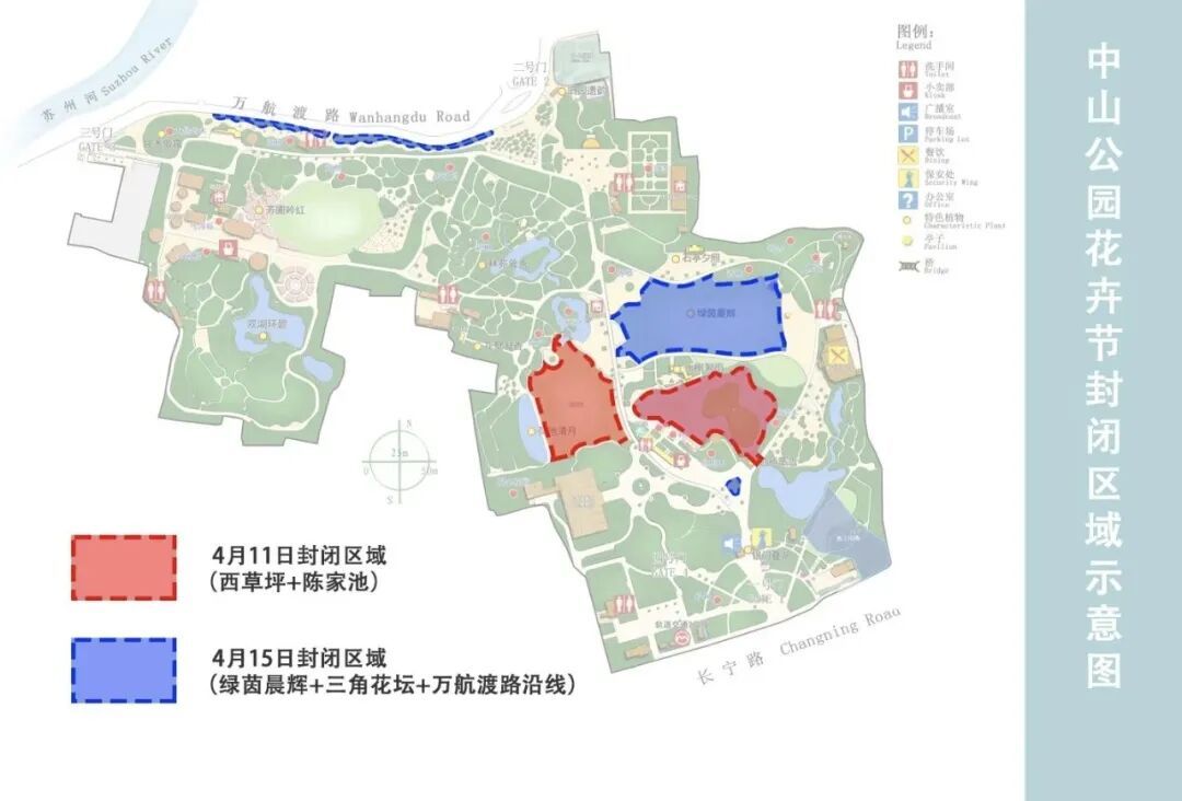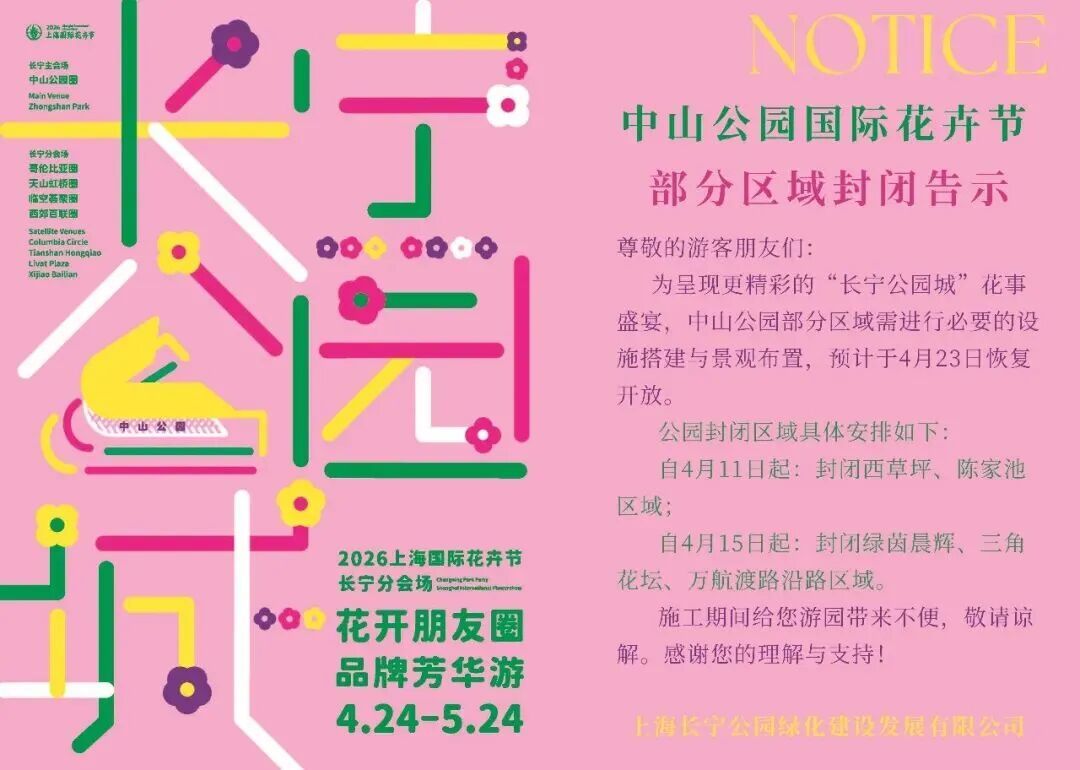 记者从区绿化市容局获悉,四月下旬,2026上海国际花卉节长宁分会场将在中山公园启幕,为了呈现更精彩的“长宁公园城”花事盛宴,中山公园部分区域需进行必要的设施搭建与景观布置,预计于4月23日恢复开放。