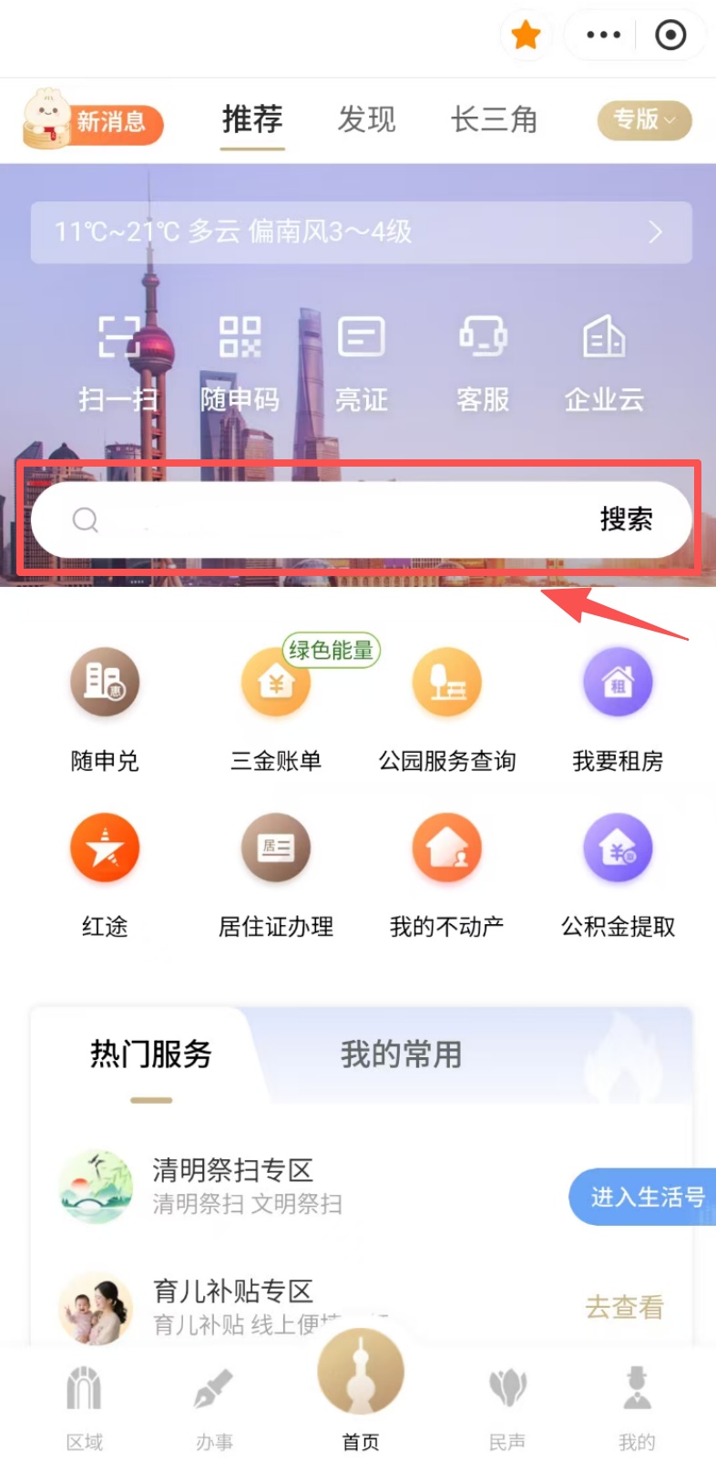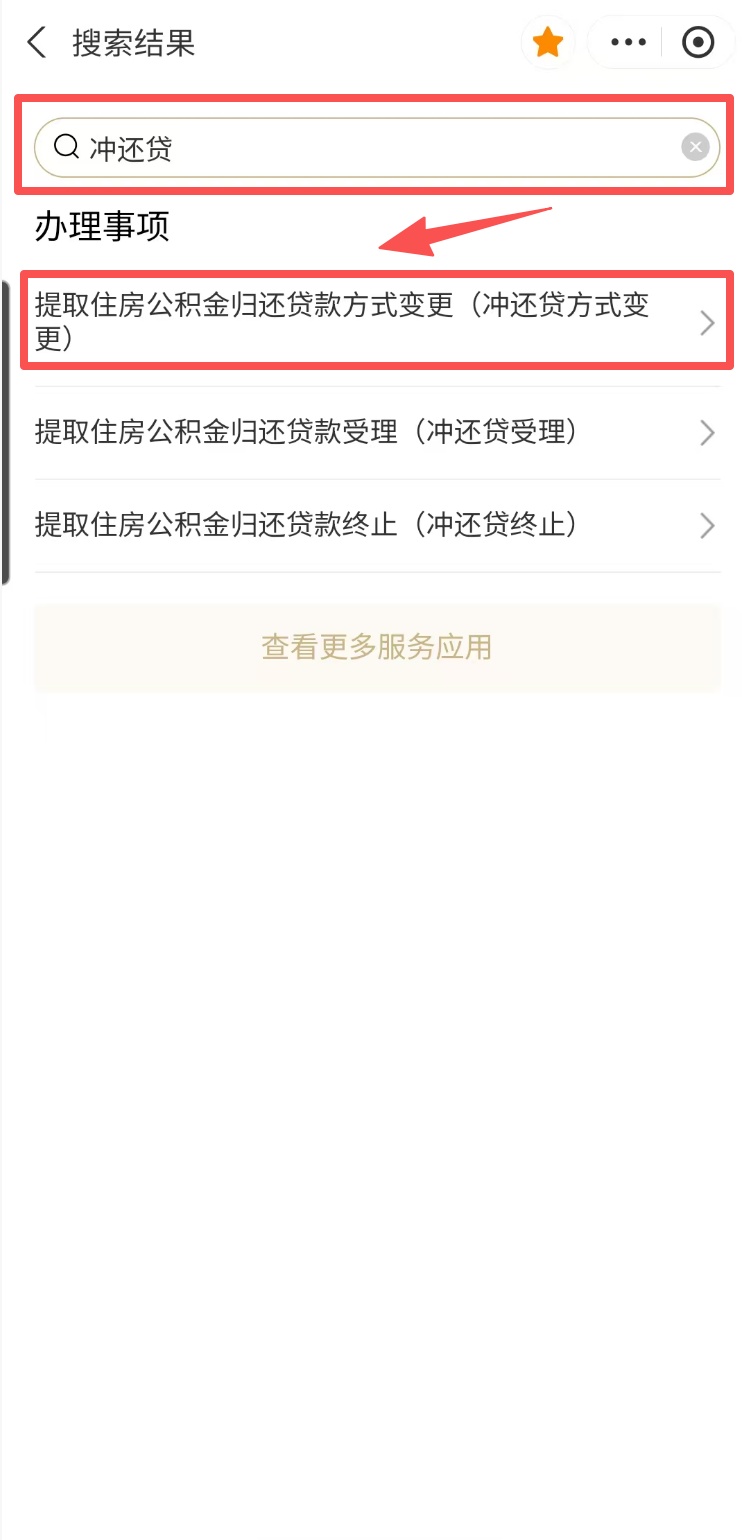 1、主贷人打开“随申办市民云”(APP/微信小程序/支付宝小程序),在首页搜索框中输入关键词“冲还贷”,找到“提取住房公积金归还贷款方式变更(冲还贷方式变更)”服务,点击进入。