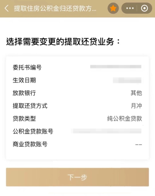 3、选择需要变更的提取还贷业务,核对信息,点击“下一步”。