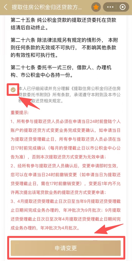 5、再次核对变更信息,阅读并勾选同意《提取住房公积金归还住房贷款委托书附则》后,点击“申请变更”按钮,借款人即可完成申请提交。