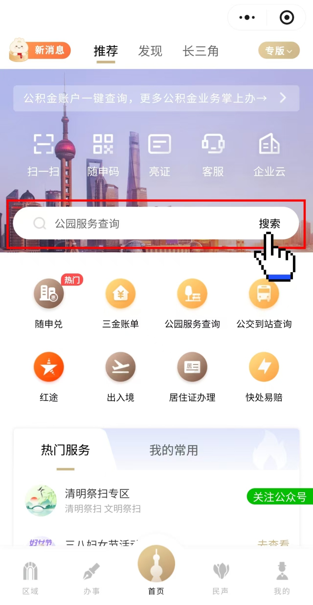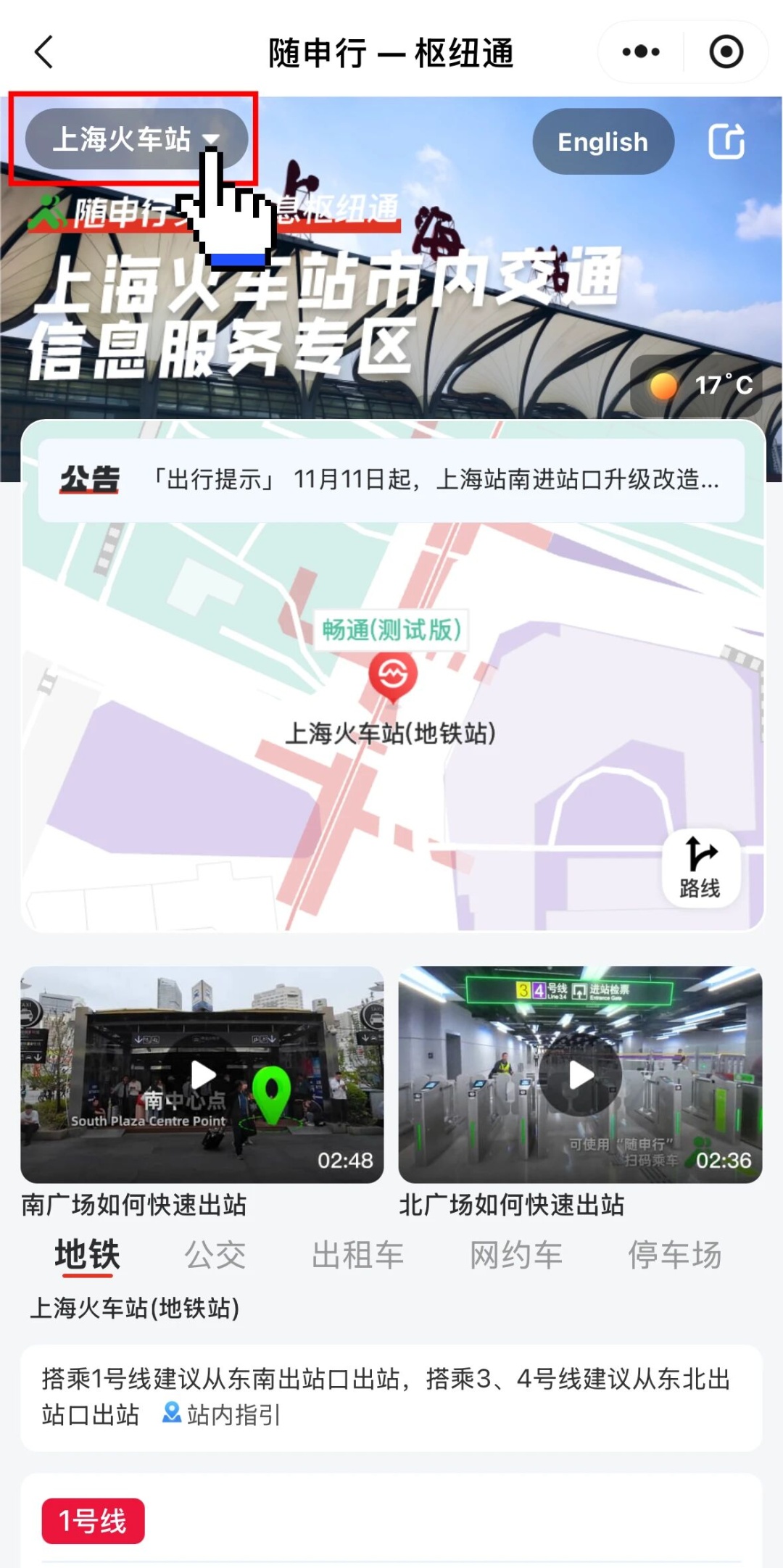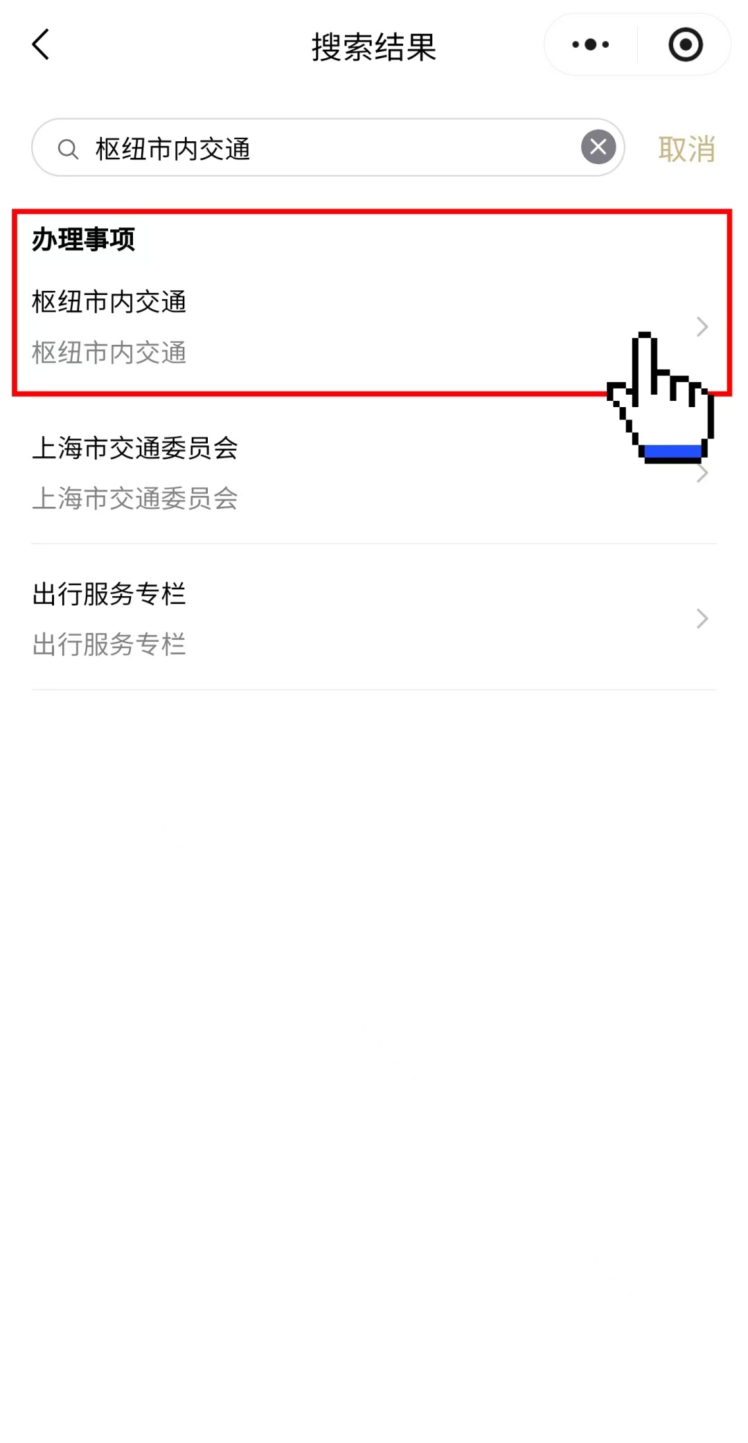 打开“随申办市民云”(APP/微信小程序/支付宝小程序),首页搜索栏输入「枢纽市内交通」,并点击进入专区。