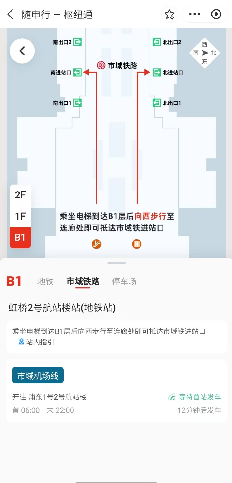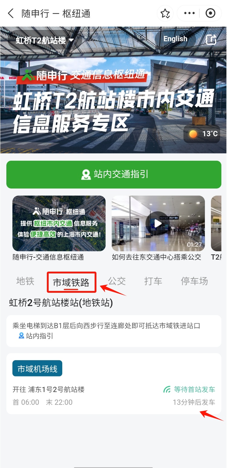以“虹桥T2航站楼”为例,选择“市域铁路”,一键查看首末班车时刻表及发车信息。