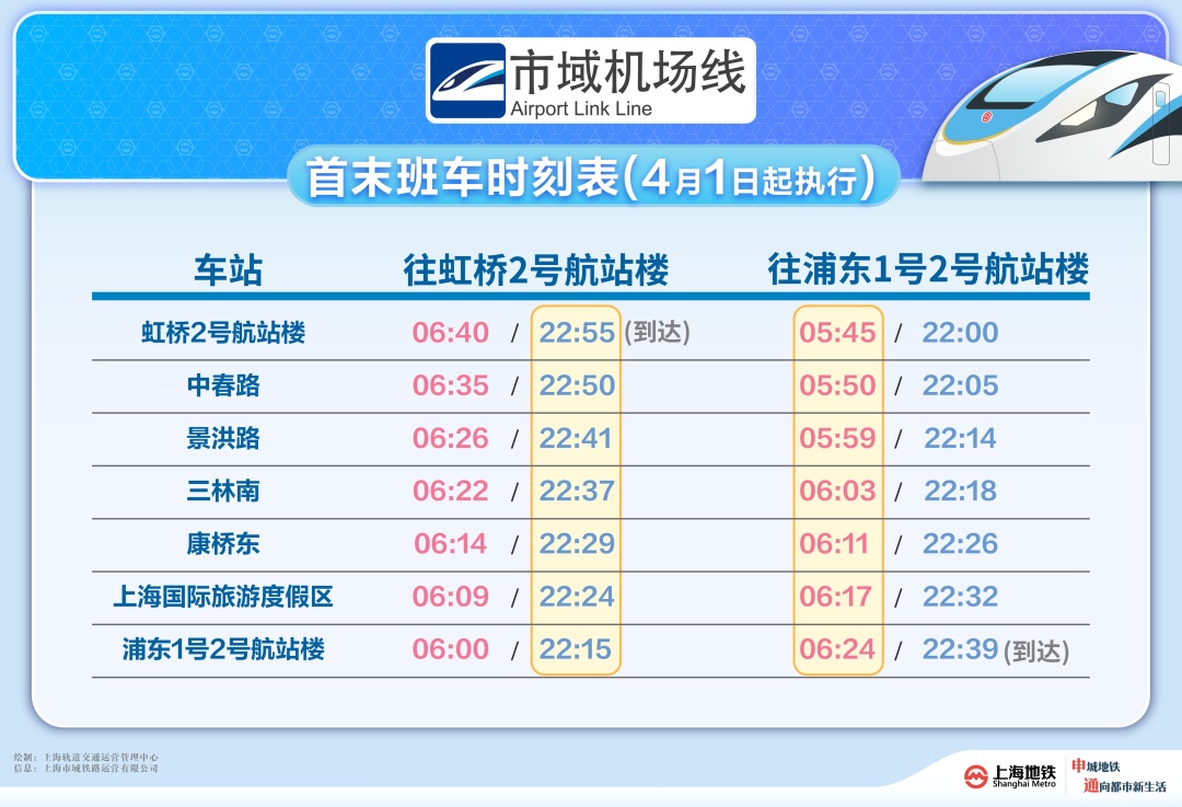 据申通地铁集团介绍,为进一步适应市域机场线客流变化,提升乘客出行体验,2026年4月1日起,上海轨道交通市域线机场联络线(简称“市域机场线”)将启用新版列车运行图,对首末班车时间进行调整优化,较之前全天多运营30分钟。