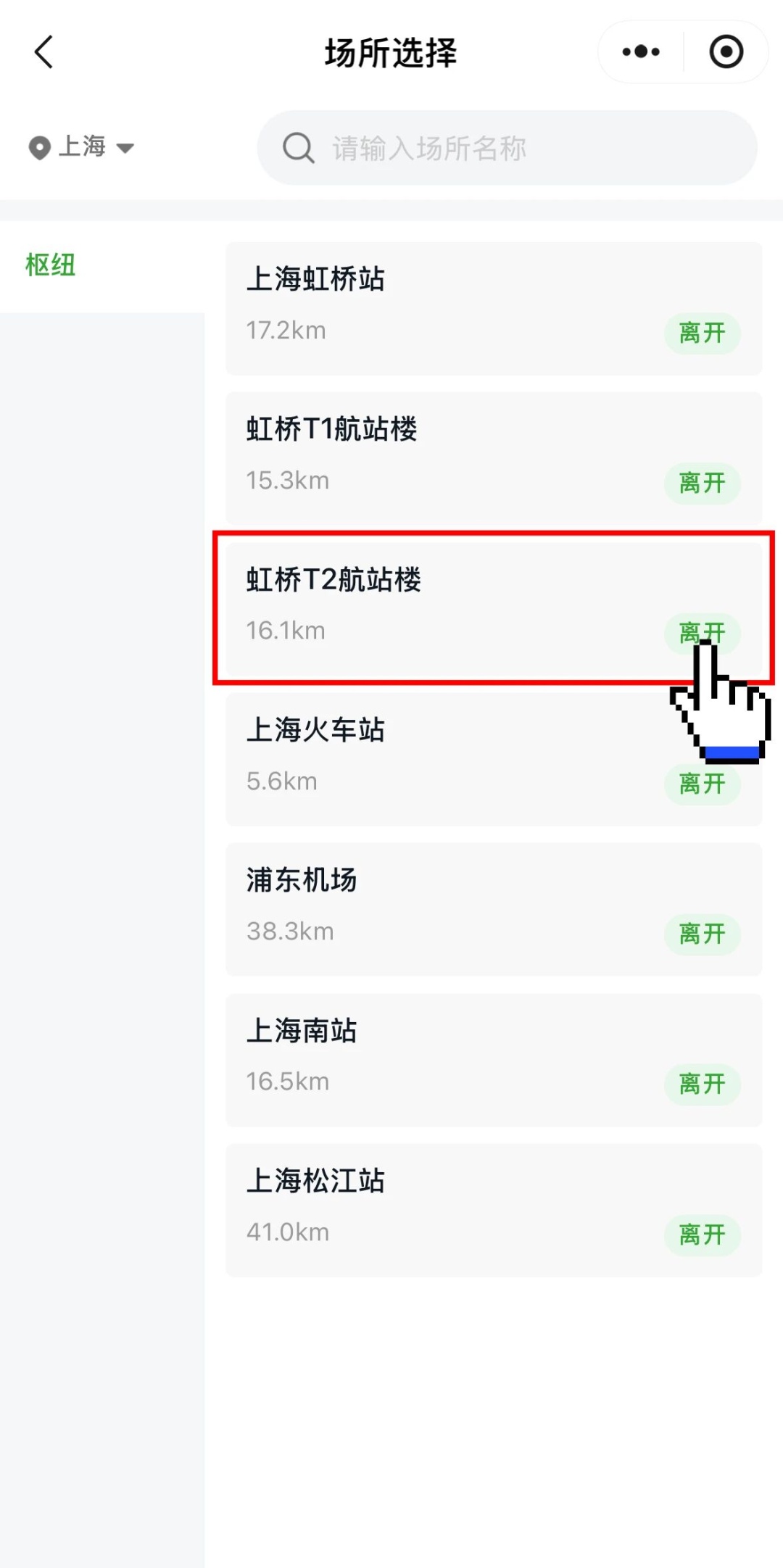 进入专区后,在界面上可以看到左上角的选站按钮,点开选站按钮即可看到上海的各大站点,选择「虹桥T2航站楼」即可。