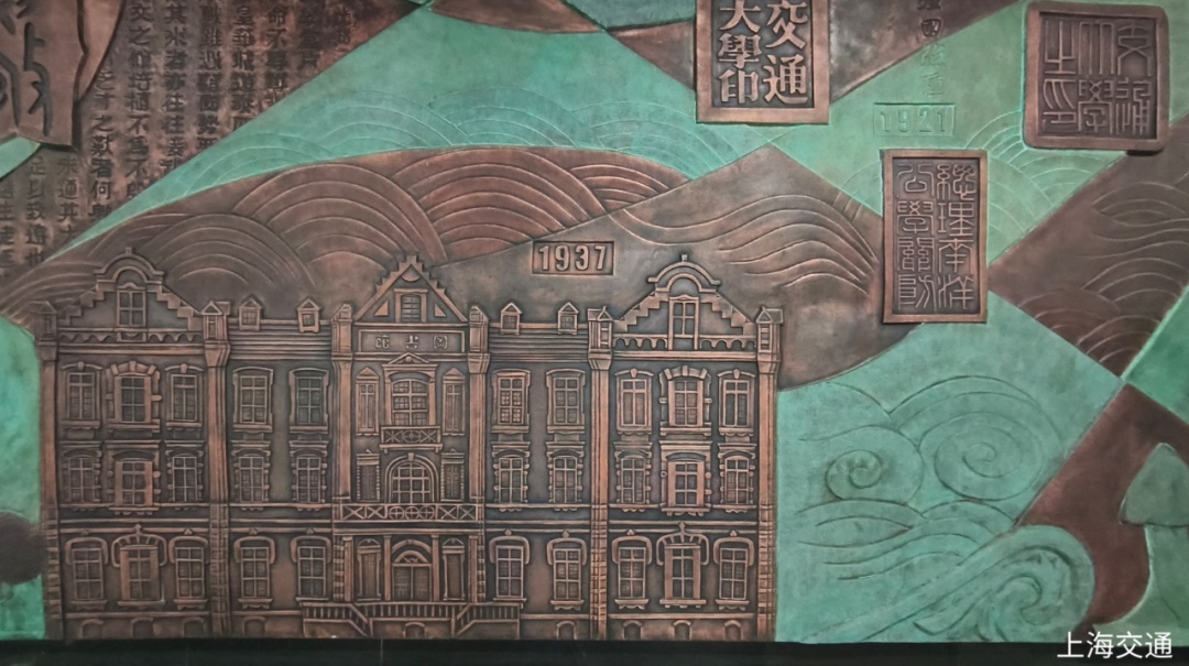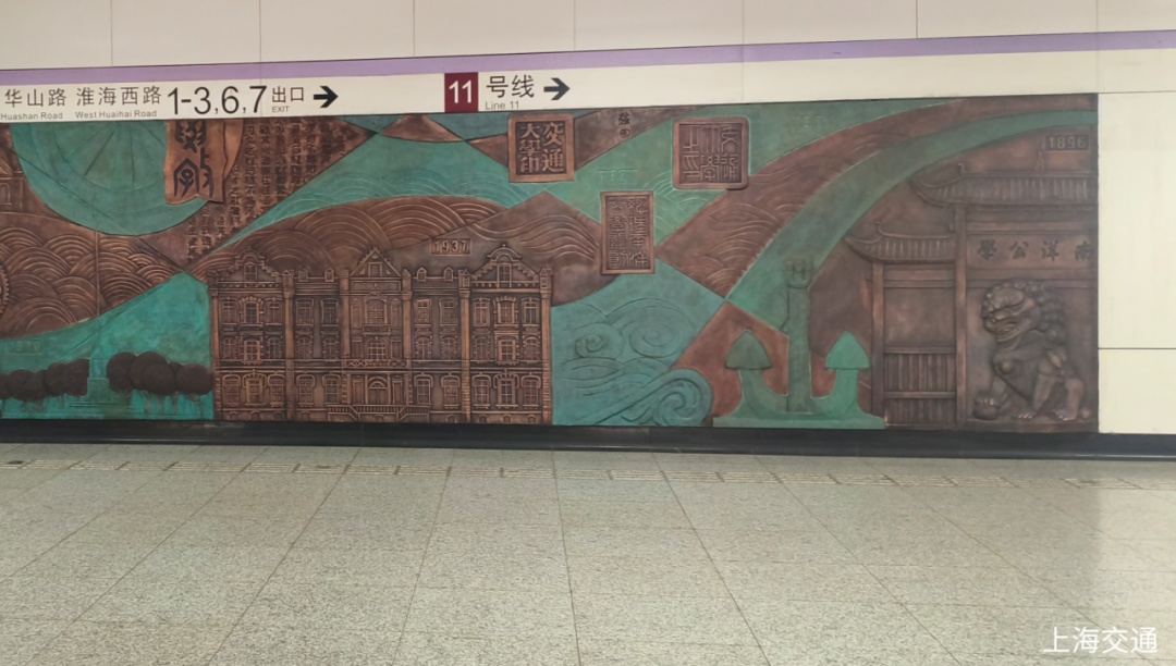 10号线交通大学站站厅的一面墙壁上装饰着一幅名为《交大百年辉煌》的壁画,其运用现代雕塑的抽象构成和传统具象元素相结合的手法,表现出交大百年辉煌蓬勃的历史。