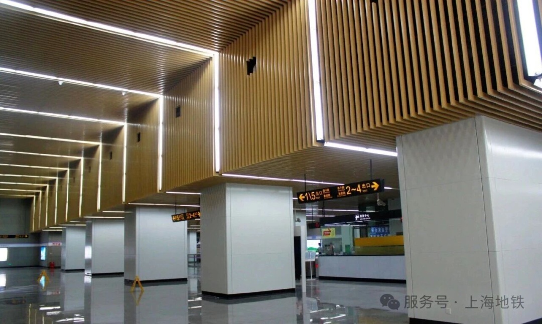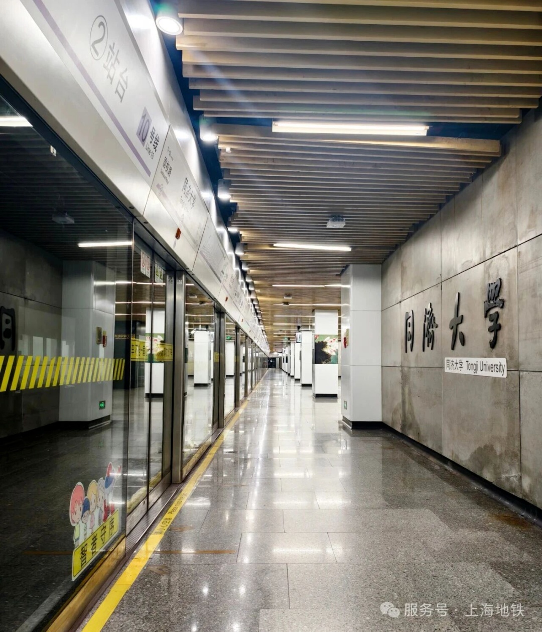 10号线同济大学站的设计理念从同济大学校训 “同舟共济” 吸取灵感,运用船桨作为元素。室内装修利用上部的下立交空间创造出站厅局部7.2米高的净高空间,并设置了自然采光天窗。