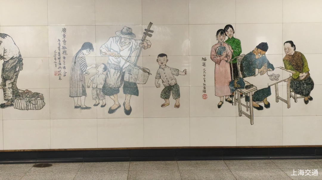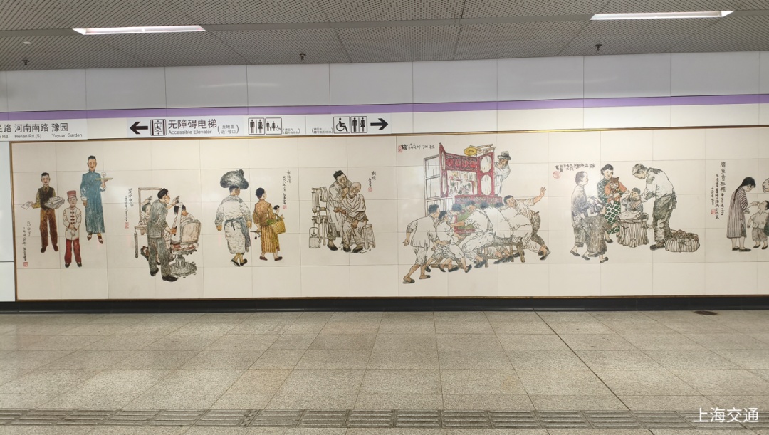 豫园站内最具特色的当属墙面上的老上海风俗画,来往豫园的游客在地铁站内便可触摸到生动的、鲜活的老上海,也重温了那段遥远的岁月。