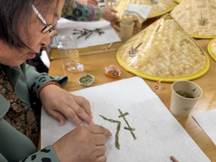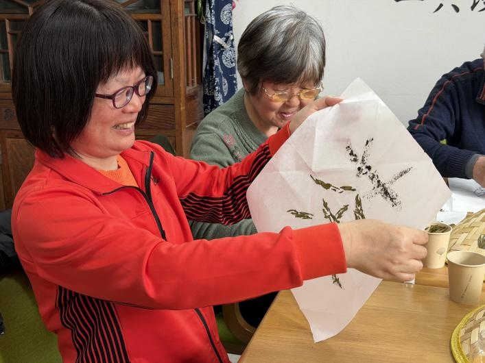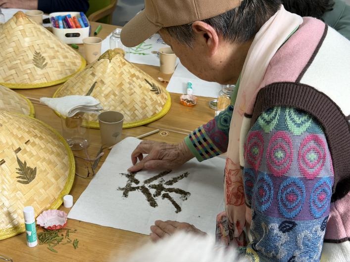 时隔一年,工作人员决定以一种更富创意的方式续写这份春日记忆——在重温去年云踏青视频、共品龙井茶的同时,引导老人们用茶本身进行“书法创作”:将茶饼轻轻掰碎,以碎茶叶为“笔墨”,在纸上一笔一划拼贴出一个完整的“茶”字。从“看茶”到“品茶”再到“以茶写字”,活动层层递进,既呼应了去年的主题,又带来了全新的感官与认知刺激。