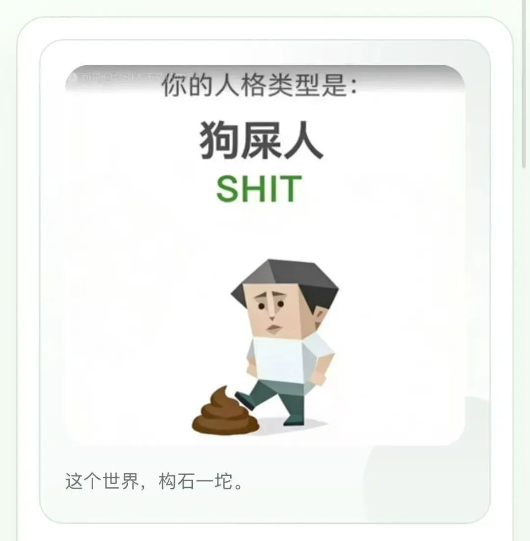 据了解,该测试以MBTI为灵感框架,通过完成答题之后测出“尤物”、“吗喽”等抽象自嘲标签。因其内容具有荒诞性与戏谑色彩引发社交狂欢,用于调侃现代年轻人的情绪状态和生活压力,但本质是纯娱乐产物,与MBTI的科学性存在根本差异。