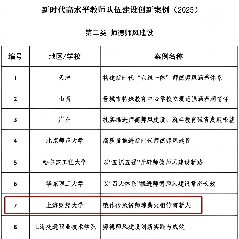 我校入选案例立足新时代教师队伍薪火相传、接续发展的现实背景,以教职工荣休工作为创新抓手和重要载体,将其深度融入师德师风建设、教职工全周期荣誉体系和校园文化塑造,通过顶层设计建机制、品牌引领涵氛围、聚焦传承育新人,实现教育家精神与上财文化的代际赓续,厚植师德根基,赋能青年教师成长,为建设具有鲜明财经特色的世界一流大学筑牢师资保障。