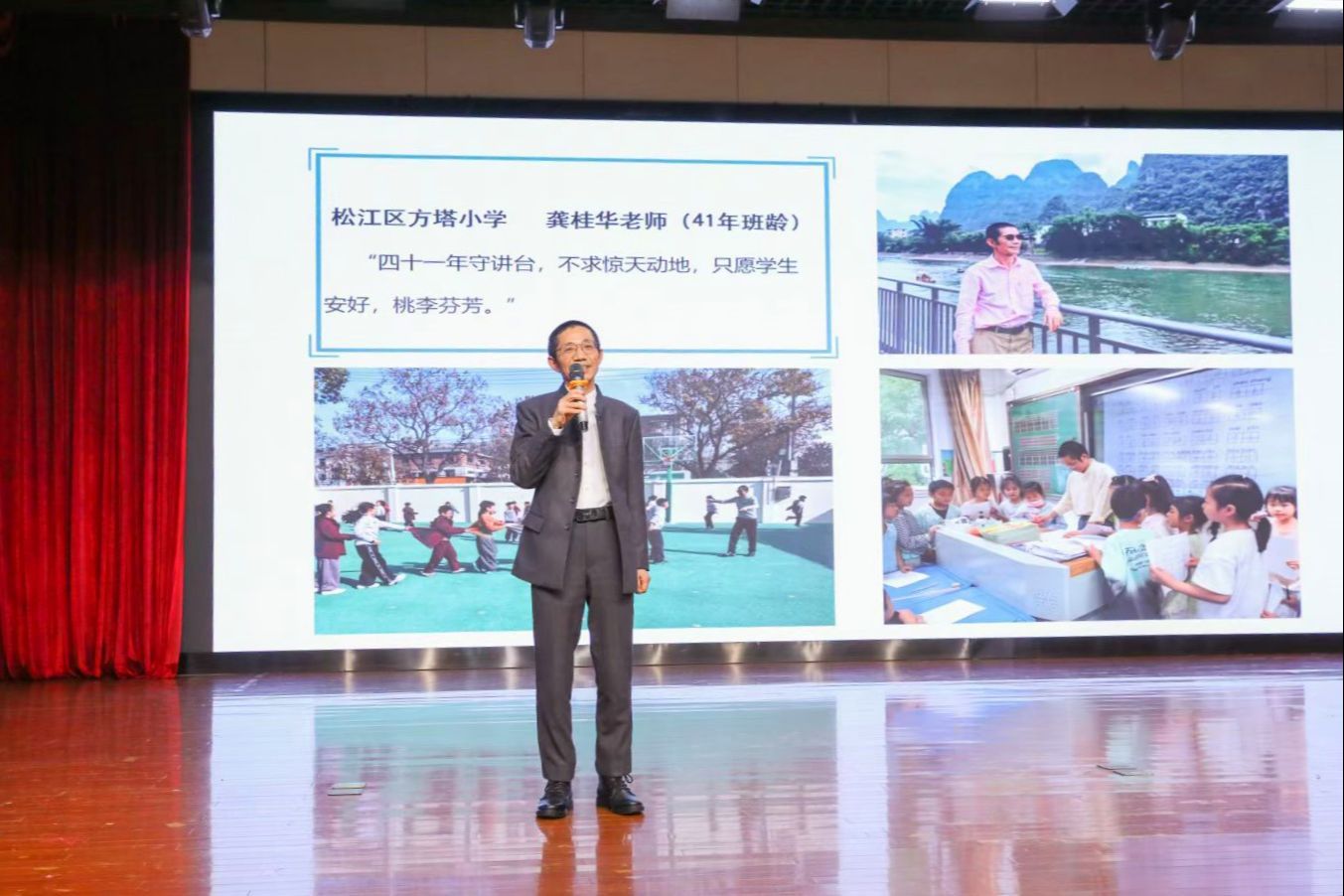 当《松江区30年班龄班主任风采展播》短视频在屏幕上播放,画面里老教师们与学生相处的笑容、对教育事业的热忱,让台下不少人红了眼眶。有着36年班主任工作经验的上戏松江附校教师吴兰英说:“得到家长信任、学生喜爱,看着孩子们一天天成长,就是最大的幸福。”东华附校的谢军也已在班主任岗位坚守34年,她坦言自己热爱与孩子们相伴,班主任不仅是知识的传播者,更是学生成长的陪伴者、引领者,“希望学生做到的,我总是要求自己先做到”。