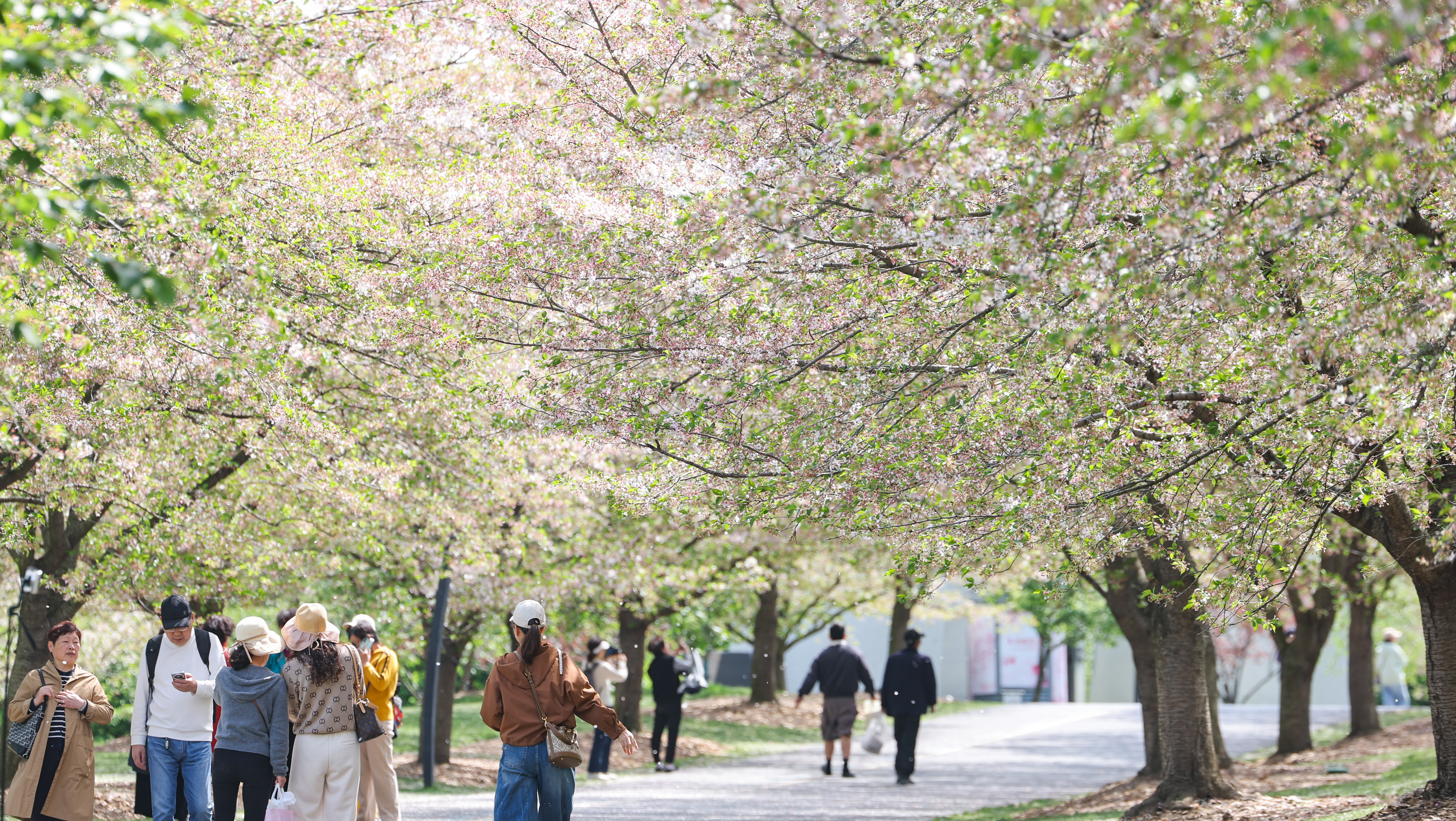 游客在樱花大道游玩。
