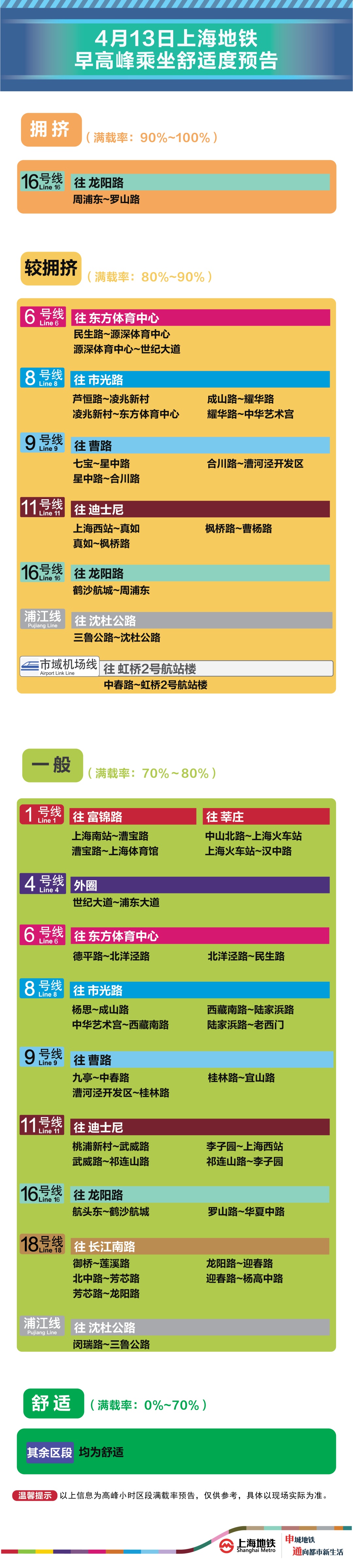 为提升上海地铁早高峰期间出行服务水平,提升乘客乘坐体验,上海地铁向乘客提供乘坐舒适度预告,方便乘客提